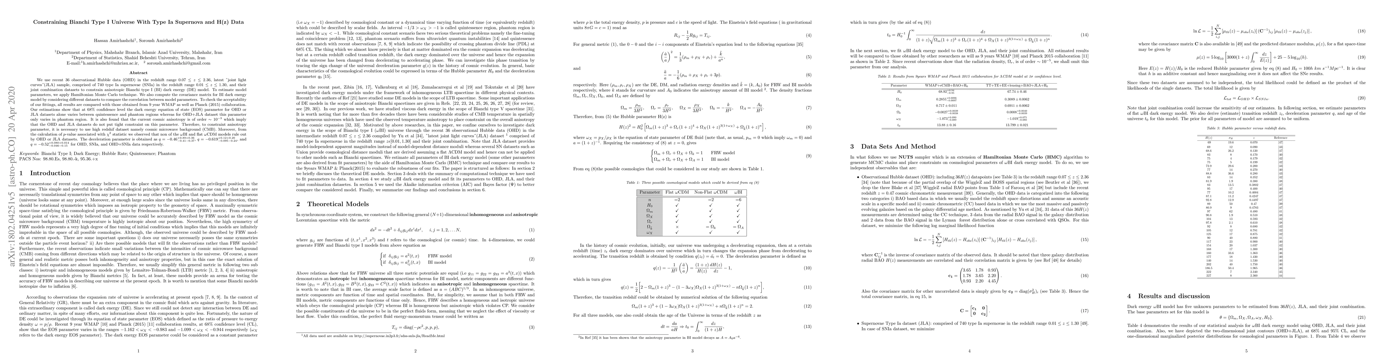 This study constrains a Bianchi Type I universe with type Ia supernovae and H(z) data, finding that the dark energy equation of state parameter varies between quintessence and phantom regions at 68% confidence level.