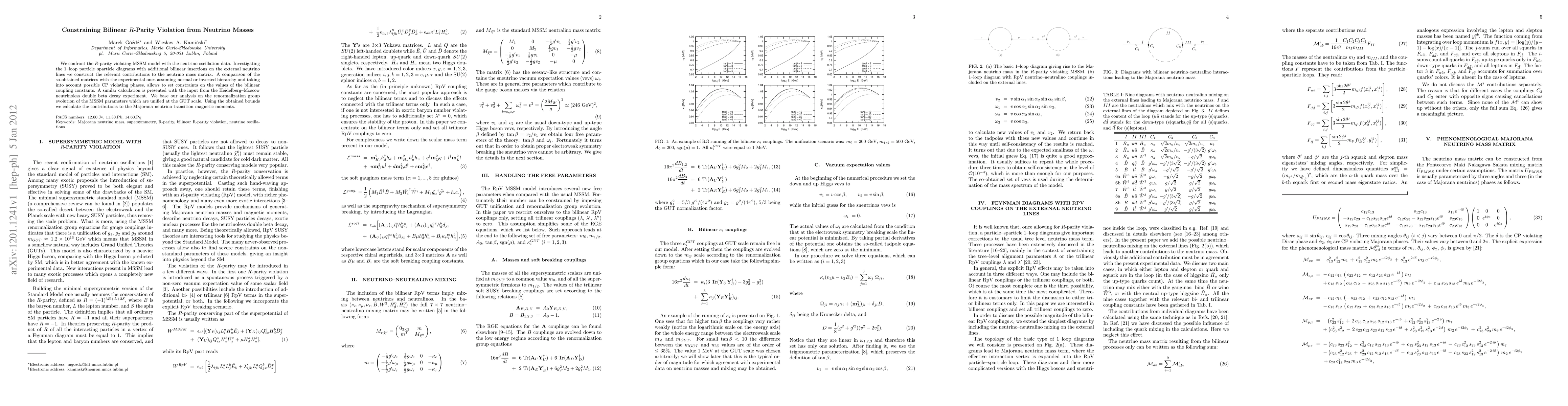 This paper investigates the R-parity violating MSSM model by comparing theoretical neutrino mass matrices derived from bilinear couplings with experimental data from neutrino oscillations and the Heidelberg-Moscow experiment. The study sets constraints on the bilinear coupling constants and calculates the resulting Majorana neutrino transition magnetic moments.