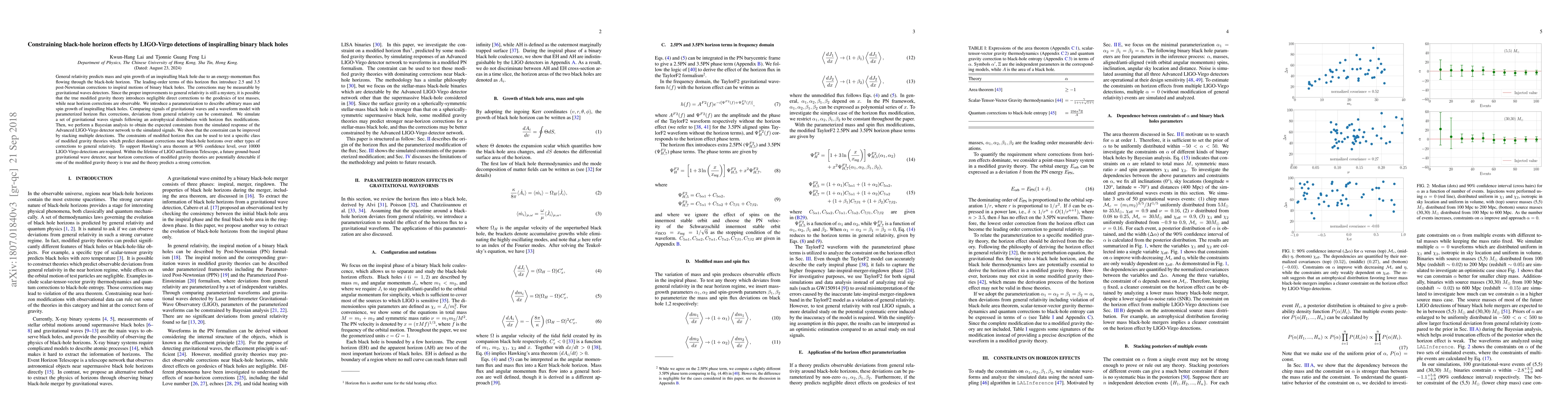 General relativity predicts mass and spin growth of an inspiralling black hole due to an energy-momentum flux flowing through the black-hole horizon. The leading-order terms of this horizon flux introduce 2.5 and 3.5 post-Newtonian corrections to inspiral motions of binary black holes. The corrections may be measurable by gravitational waves detectors. Since the proper improvements to general relativity is still a mystery, it is possible that the true modified gravity theory introduces negligible direct corrections to the geodesics of test masses, while near horizon corrections are observable. We introduce a parameterization to describe arbitrary mass and spin growth of inspiralling black holes. Comparing signals of gravitational waves and a waveform model with parameterized horizon flux corrections, deviations from general relativity can be constrained. We simulate a set of gravitational waves signals following an astrophysical distribution with horizon flux modifications. Then, we perform a Bayesian analysis to obtain the expected constraints from the simulated response of the Advanced LIGO-Virgo detector network to the simulated signals. We show that the constraint can be improved by stacking multiple detections. The constraints of modified horizon flux can be used to test a specific class of modified gravity theories which predict dominant corrections near black-hole horizons over other types of corrections to general relativity. To support Hawking's area theorem at 90\% confidence level, over 10000 LIGO-Virgo detections are required. Within the lifetime of LIGO and Einstein Telescope, a future ground-based gravitational wave detector, near horizon corrections of modified gravity theories are potentially detectable if one of the modified gravity theory is true and the theory predicts a strong correction.