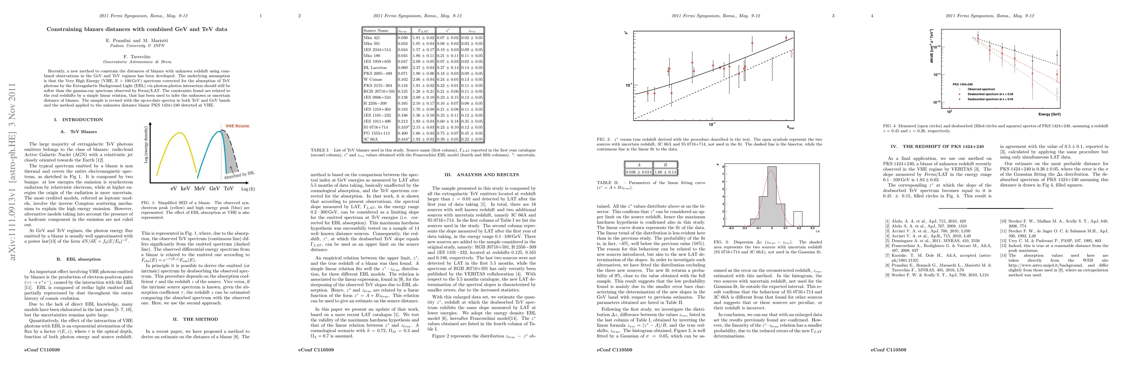 Recently, a new method to constrain the distances of blazars with unknown redshift using combined observations in the GeV and TeV regimes has been developed. The underlying assumption is that the Very High Energy (VHE, E > 100 GeV) spectrum corrected for the absorption of TeV photons by the Extragalactic Background Light (EBL) via photon-photon interaction should still be softer than the gamma-ray spectrum observed by Fermi/LAT. The constraints found are related to the real redshifts by a simple linear relation, that has been used to infer the unknown or uncertain distance of blazars. The sample is revised with the up-to-date spectra in both TeV and GeV bands and the method applied to the unknown distance blazar PKS 1424+240 detected at VHE.