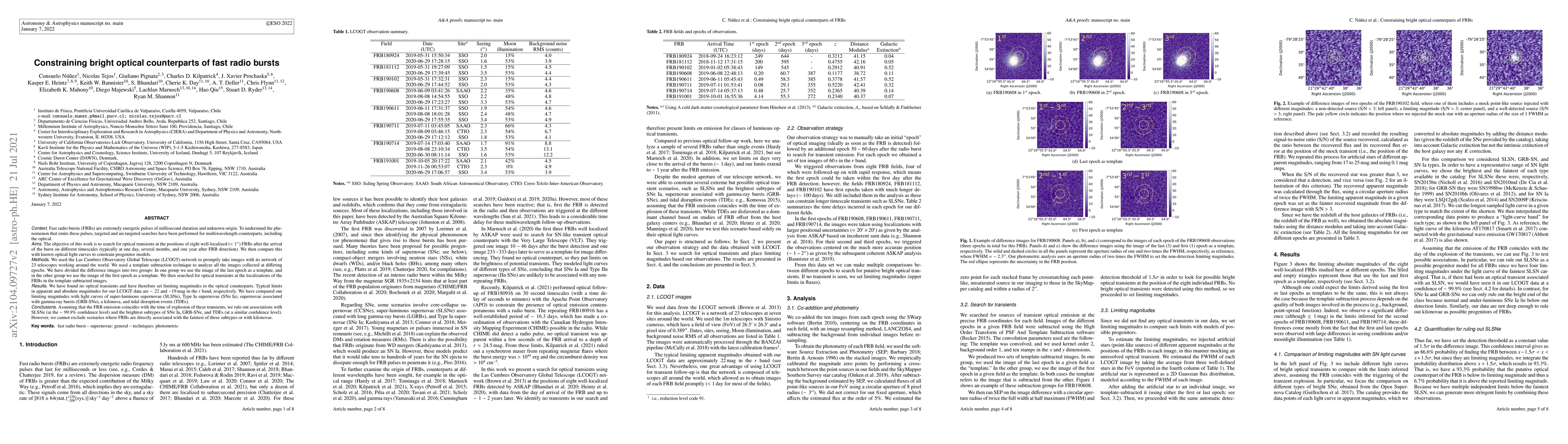 A study of 8 Fast Radio Bursts (FRBs) found no bright optical counterparts within a 1 arcsec radius, setting limiting magnitudes of ~22 mag in apparent magnitude, ruling out associations with certain types of supernovae and other transients.