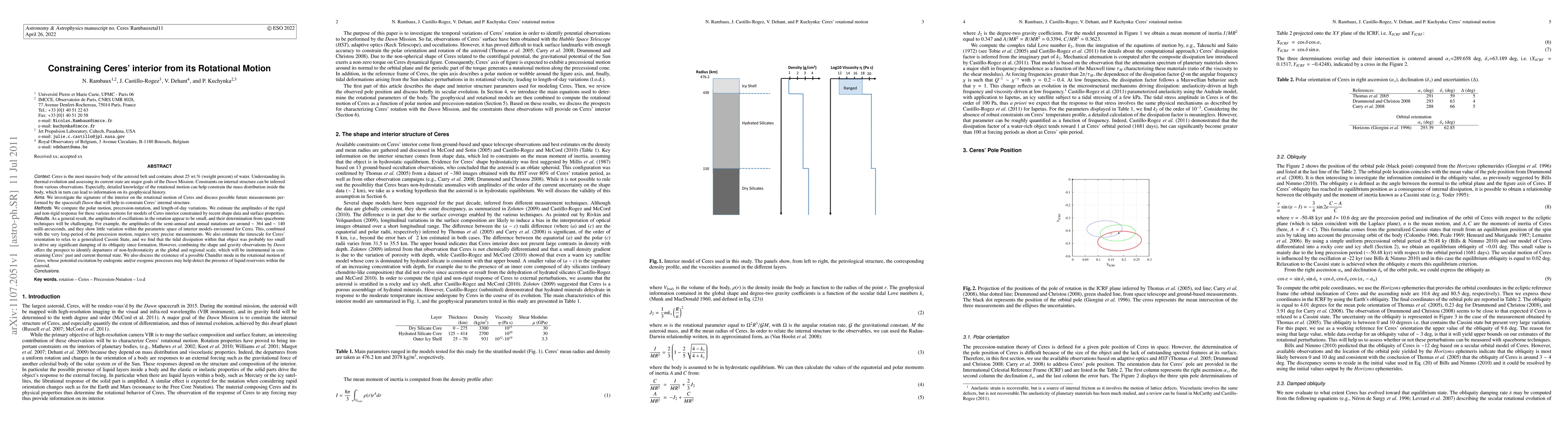 This paper investigates how Ceres' rotational motion can provide insights into its internal structure, revealing small oscillation amplitudes and challenging measurement precision requirements. The study suggests that combining Dawn spacecraft observations of shape and gravity could help identify non-hydrostatic features, aiding in the understanding of Ceres' thermal history and potential liquid reservoirs.