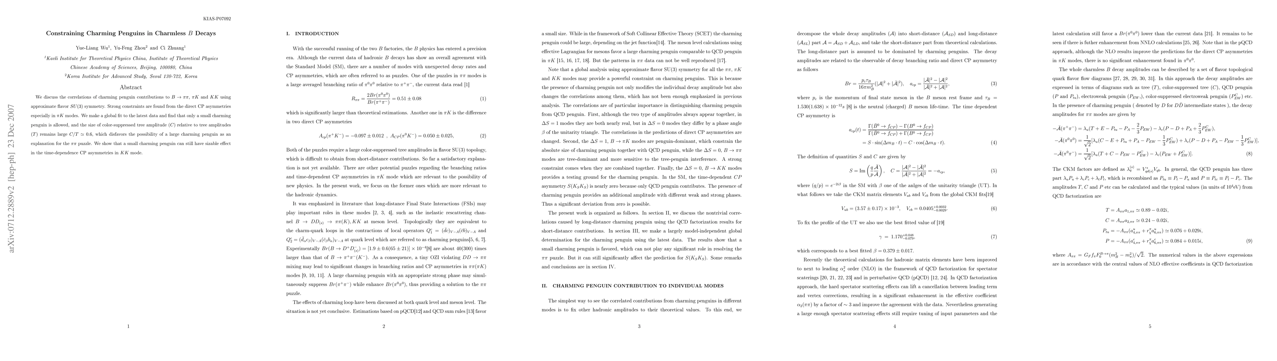 We discuss the correlations of charming penguin contributions to $B\to\pi\pi$, $\pi K$ and KK using approximate flavor SU(3) symmetry. Strong constraints are found from the direct CP asymmetries especially in $\pi K$ modes. We make a global fit to the latest data and find that only a small charming penguin is allowed, and the size of color-suppressed tree amplitude (C) relative to tree amplitudes (T) remains large $C/T\simeq0.6$, which disfavors the possibility of a large charming penguin as an explanation for the $\pi\pi$ puzzle. We show that a small charming penguin can still have sizable effect in the time-dependence CP asymmetries in KK mode.