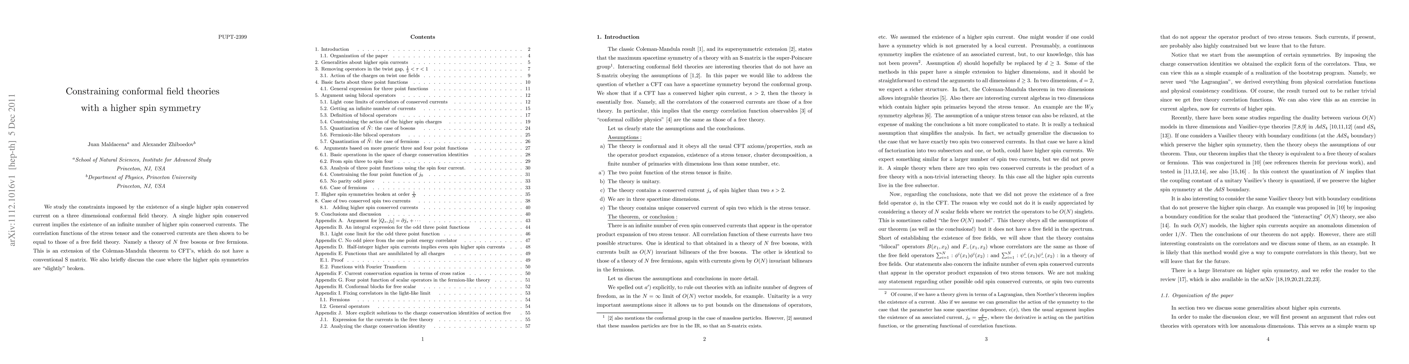 Summary: The research explores the constraints on three-dimensional conformal field theories (CFTs) with a single higher spin conserved current, showing it leads to infinite higher spin symmetries and correlation functions akin to those of a free field theory, extending the Coleman-Mandula theorem to CFTs. It also briefly considers scenarios with slight higher spin symmetry breaking.