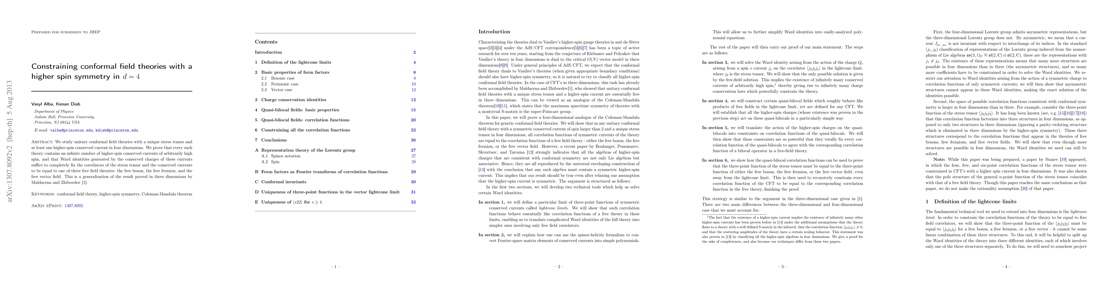 This paper proves that in four dimensions, unitary conformal field theories with a unique stress tensor and at least one higher-spin conserved current possess an infinite number of such currents and are constrained to be equivalent to three free field theories: the free boson, the free fermion, and the free vector field. This generalizes a previous result from three dimensions.