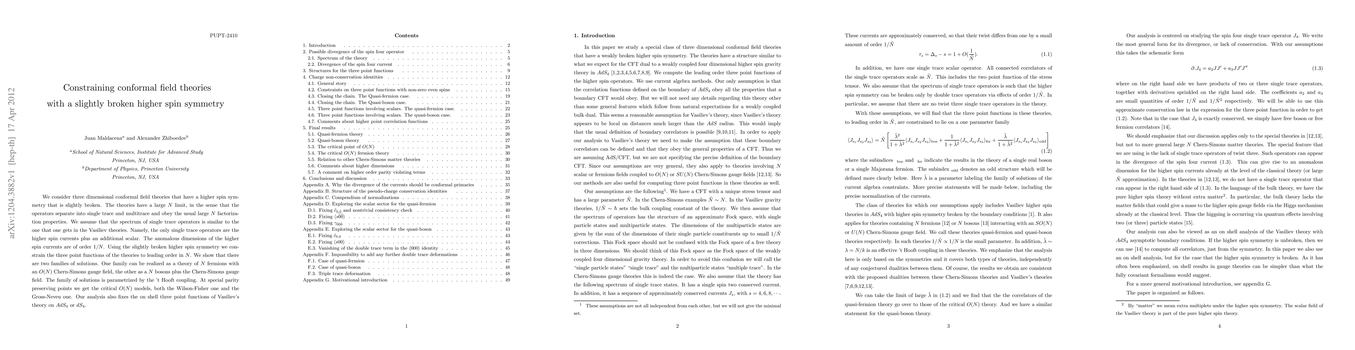 This paper explores three-dimensional conformal field theories with a slightly broken higher spin symmetry, constraining their three-point functions and revealing two families of solutions: one involving N fermions with an O(N) Chern-Simons gauge field, and the other involving N bosons with the same gauge field. The analysis also fixes the on-shell three-point functions for Vasiliev's theory in AdS_4 or dS_4.