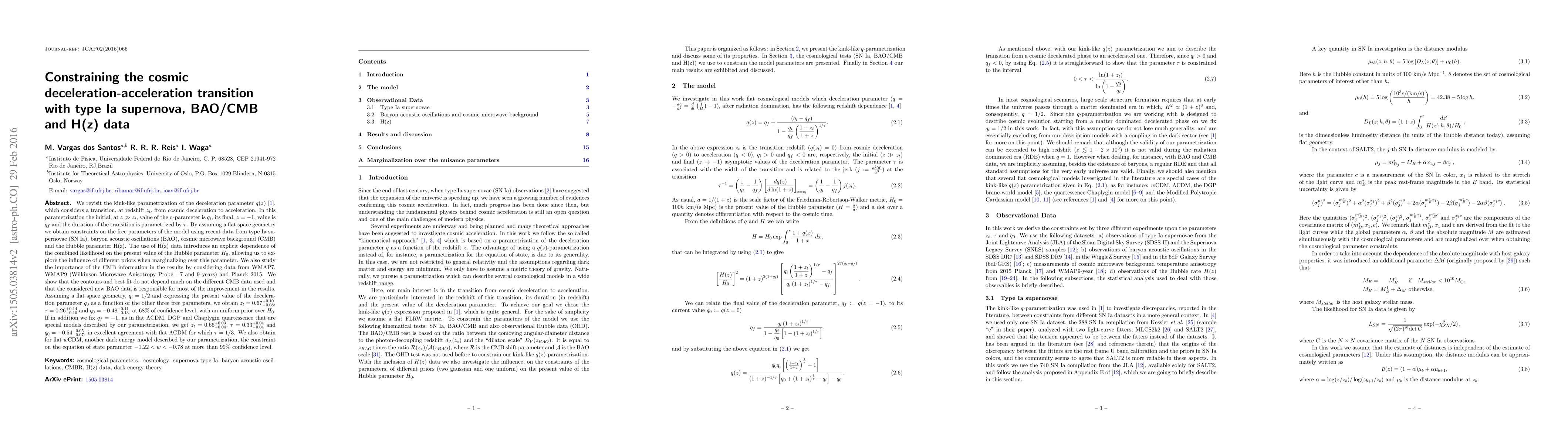 We revisit the kink-like parametrization of the deceleration parameter q(z), which considers a transition, at $z_t$, from cosmic deceleration to acceleration. In this parametrization the initial, at $z \gg z_t$, value of the q-parameter is $q_i$, its final, z=-1, value is $q_f$ and the duration of the transition is parametrized by $\tau$. By assuming a flat space geometry we obtain constraints on the free parameters of the model using recent data from type Ia supernovae, BAO, CMB and the Hubble parameter H(z). The use of H(z) data introduces an explicit dependence of the combined likelihood on the present value of the Hubble parameter $H_0$, allowing us to explore the influence of different priors when marginalizing over this parameter. We also study the importance of the CMB information in the results by considering data from WMAP7, WMAP9 and Planck. We show that the contours and best fit do not depend much on the different CMB data used and that the considered new BAO data is responsible for most of the improvement in the results. Assuming a flat space geometry, $q_i=1/2$ and expressing the present value of the deceleration parameter $q_0$ as a function of the other three free parameters, we obtain $z_t=0.67^{+0.10}_{-0.08}$, $\tau=0.26^{+0.14}_{-0.10}$ and $q_0=-0.48^{+0.11}_{-0.13}$, at 68\% of confidence level, with an uniform prior over $H_0$. If in addition we fix $q_f=-1$, as in flat $\Lambda$CDM, DGP and Chaplygin quartessence that are special models described by our parametrization, we get $z_t=0.66^{+0.03}_{-0.04}$, $\tau=0.33^{+0.04}_{-0.04}$ and $q_0=-0.54^{+0.05}_{-0.07}$, in excellent agreement with flat $\Lambda$CDM for which $\tau=1/3$. We also obtain for flat wCDM, another dark energy model described by our parametrization, the constraint on the equation of state parameter -1.22 < w < -0.78 at more than 99% confidence level.