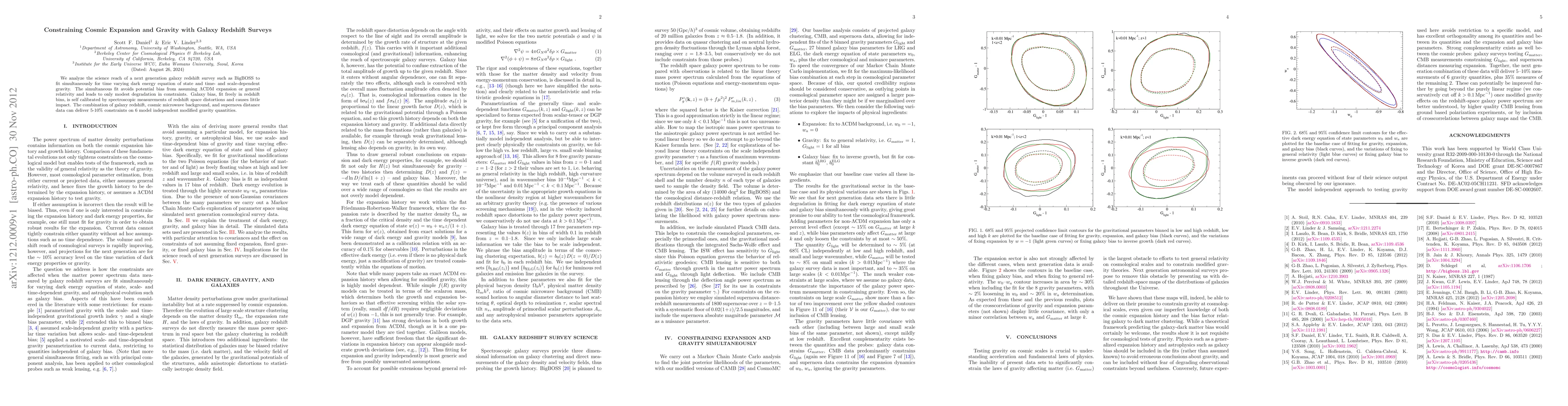 We analyze the science reach of a next generation galaxy redshift survey such as BigBOSS to fit simultaneously for time varying dark energy equation of state and time- and scale-dependent gravity. The simultaneous fit avoids potential bias from assuming $\Lambda$CDM expansion or general relativity and leads to only modest degradation in constraints. Galaxy bias, fit freely in redshift bins, is self calibrated by spectroscopic measurements of redshift space distortions and causes little impact. The combination of galaxy redshift, cosmic microwave background, and supernova distance data can deliver 5-10% constraints on 6 model independent modified gravity quantities.
