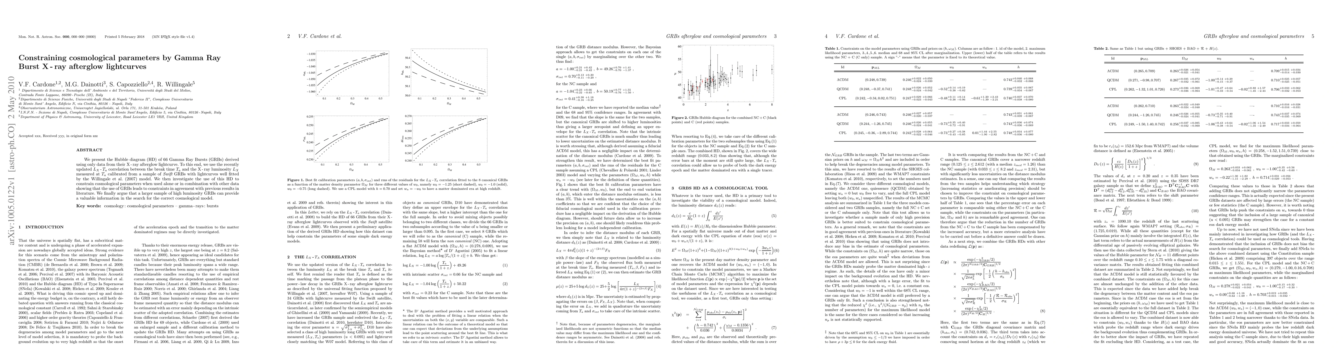 We present the Hubble diagram (HD) of 66 Gamma Ray Bursts (GRBs) derived using only data from their X - ray afterglow lightcurve. To this end, we use the recently updated L_X - T_a correlation between the break time T_a and the X - ray luminosity L_X measured at T_a calibrated from a sample of Swift GRBs with lightcurves well fitted by the Willingale et al. (2007) model. We then investigate the use of this HD to constrain cosmological parameters when used alone or in combination with other data showing that the use of GRBs leads to constraints in agreement with previous results in literature. We finally argue that a larger sample of high luminosity GRBs can provide a valuable information in the search for the correct cosmological model.