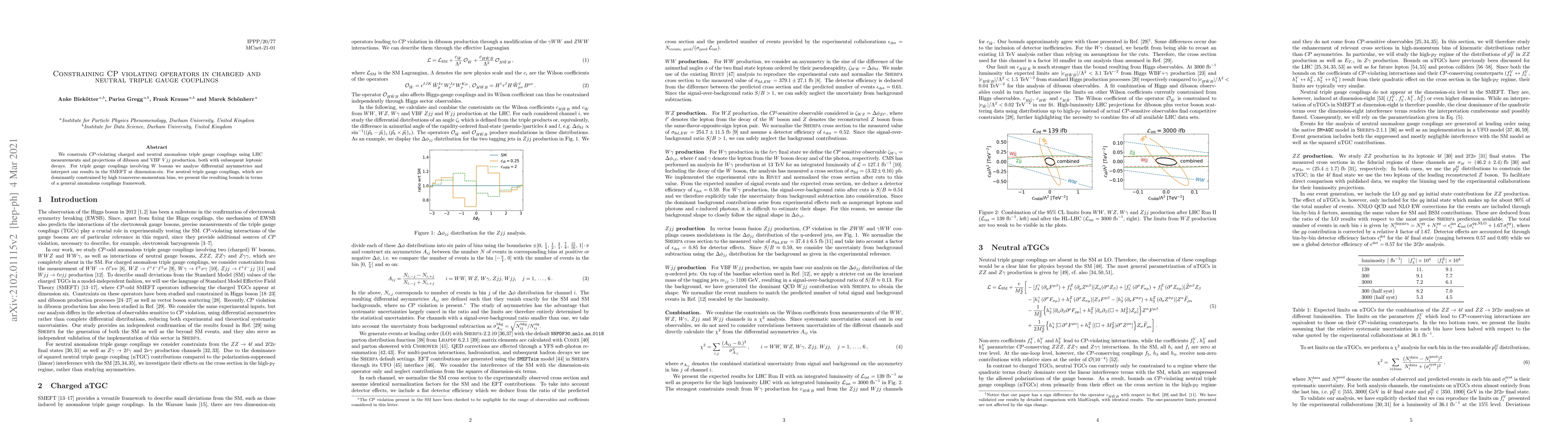 We constrain $C\!P$-violating charged and neutral anomalous triple gauge couplings using LHC measurements and projections of diboson and VBF $Vjj$ production, both with subsequent leptonic decays. For triple gauge couplings involving $W$ bosons we analyse asymmetries and interpret our results in the SMEFT at dimension-six. For neutral triple gauge couplings, which are dominantly constrained by high transverse-momentum bins, we present the resulting bounds in terms of a general anomalous couplings framework.