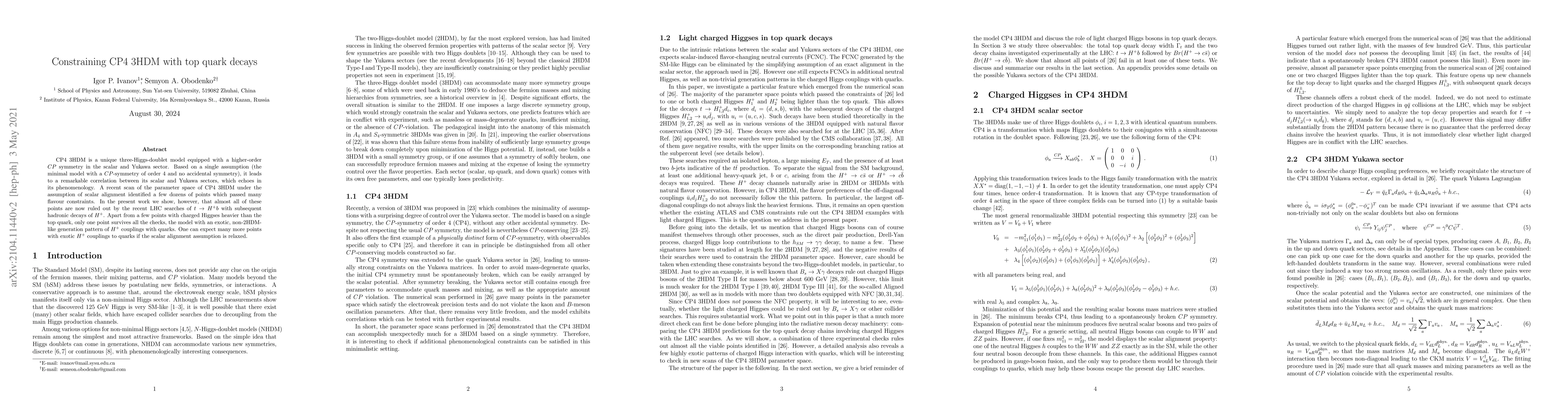 CP4 3HDM is a unique three-Higgs-doublet model equipped with a higher-order CP symmetry in the scalar and Yukawa sector. Based on a single assumption (the minimal model with a CP-symmetry of order 4 and no accidental symmetry), it leads to a remarkable correlation between its scalar and Yukawa sectors, which echoes in its phenomenology. A recent scan of the parameter space of CP4 3HDM under the assumption of scalar alignment identified a few dozens of points which passed many flavour constraints. In the present work we show, however, that almost all of these points are now ruled out by the recent LHC searches of $t \to H^+ b$ with subsequent hadronic decays of $H^+$. Apart from a few points with charged Higgses heavier than the top quark, only one point survives all the checks, the model with an exotic, non-2HDM-like generation pattern of $H^+$ couplings with quarks. One can expect many more points with exotic $H^+$ couplings to quarks if the scalar alignment assumption is relaxed.