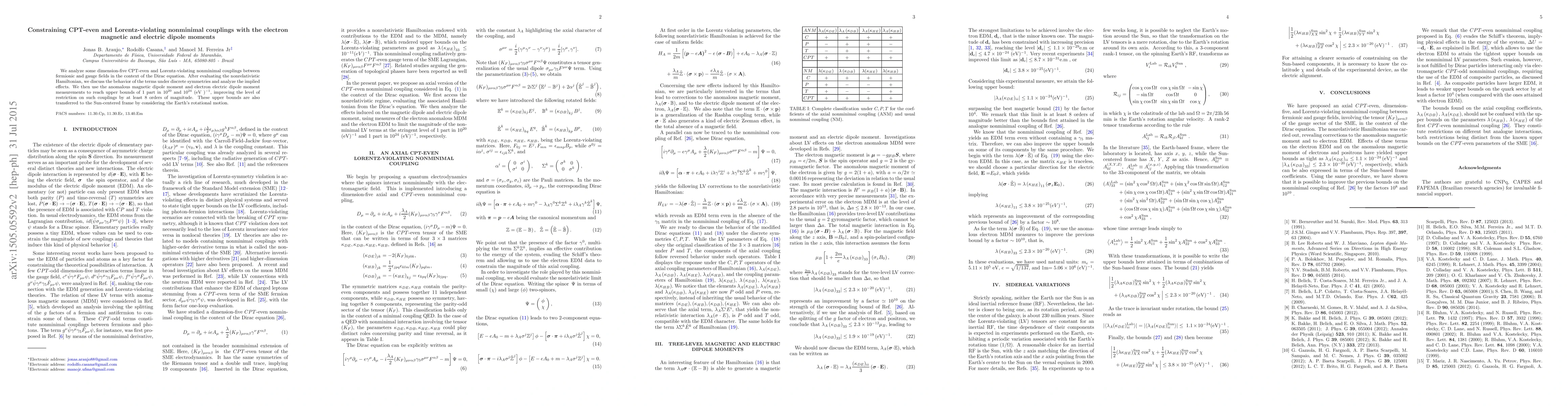 This paper investigates dimension-five CPT-even and Lorentz-violating couplings in the Dirac equation, focusing on their effects on electron magnetic and electric dipole moments. It sets stringent upper bounds on these couplings, improving previous constraints by eight orders of magnitude using experimental measurements.