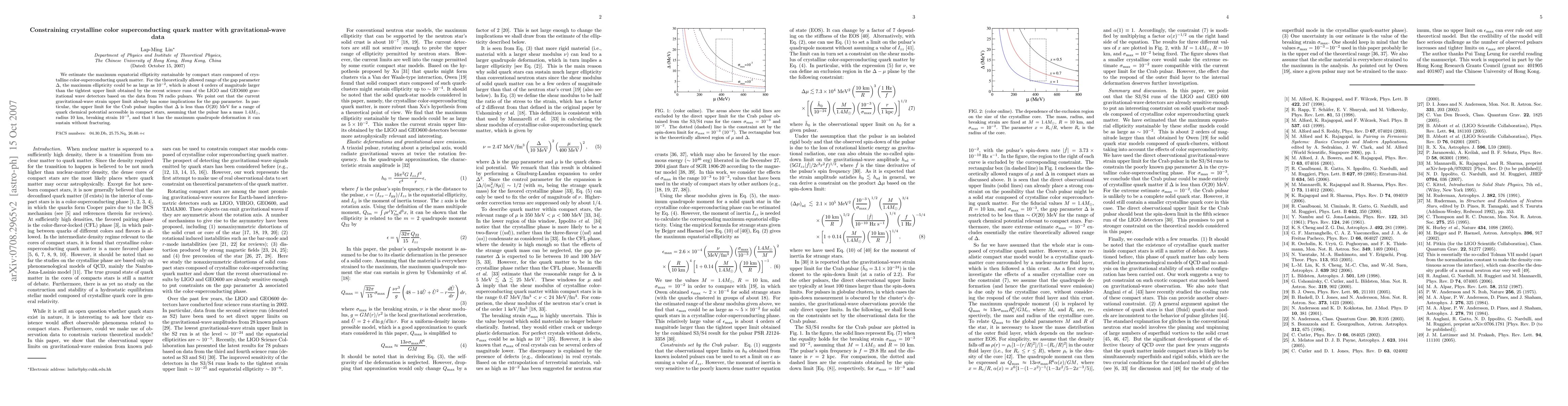 This paper estimates the maximum ellipticity of compact stars made of crystalline color-superconducting quark matter, finding it could be up to 4 orders of magnitude larger than current gravitational-wave limits. It suggests that recent gravitational-wave data already constrains the gap parameter $\Delta$ to be less than O(20) MeV for certain quark chemical potentials.