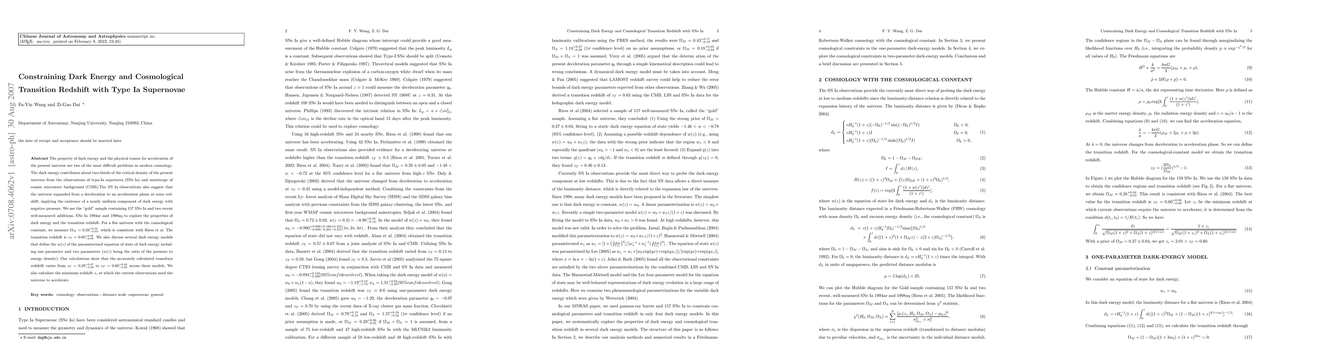 This study uses type-Ia supernovae to constrain dark energy and the transition redshift in the universe, finding a 60% confidence interval for the transition redshift and consistent results with previous observations.