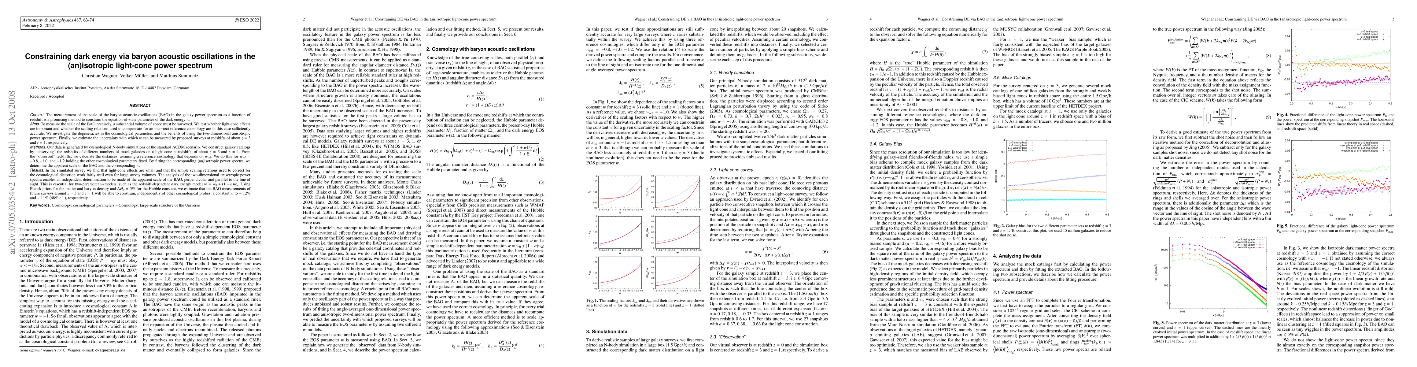 The measurement of the scale of the baryon acoustic oscillations (BAO) in the galaxy power spectrum as a function of redshift is a promising method to constrain the equation-of-state parameter of the dark energy w. To measure the scale of the BAO precisely, a substantial volume of space must be surveyed. We test whether light-cone effects are important and whether the scaling relations used to compensate for an incorrect reference cosmology are in this case sufficiently accurate. We investigate the degeneracies in the cosmological parameters and the benefits of using the two-dimensional anisotropic power spectrum. Finally, we estimate the uncertainty with which w can be measured by proposed surveys at redshifts of about z=3 and z=1, respectively. In the simulated survey we find that light-cone effects are small and that the simple scaling relations used to correct for the cosmological distortion work fairly well even for large survey volumes. The analysis of the two-dimensional anisotropic power spectra enables an independent determination to be made of the apparent scale of the BAO, perpendicular and parallel to the line of sight. This is essential for two-parameter w-models, such as the redshift-dependent dark energy model w=w_0+(1-a)w_a. Using Planck priors for the matter and baryon density and Delta(H_0)=5% for the Hubble constant, we estimate that the BAO measurements of future surveys around z=3 and z=1 will be able to constrain, independently of other cosmological probes, a constant w to ~ 12% and ~ 11% (68% c.l.), respectively.