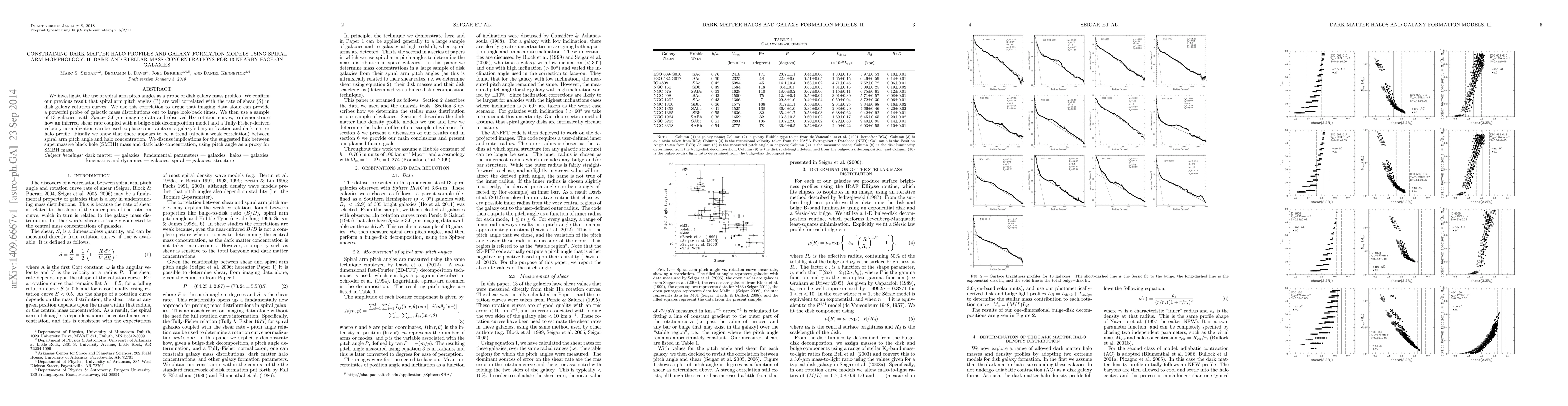 We investigate the use of spiral arm pitch angles as a probe of disk galaxy mass profiles. We confirm our previous result that spiral arm pitch angles (P) are well correlated with the rate of shear (S) in disk galaxy rotation curves. We use this correlation to argue that imaging data alone can provide a powerful probe of galactic mass distributions out to large look-back times. We then use a sample of 13 galaxies, with Spitzer 3.6-$\mu$m imaging data and observed H$\alpha$ rotation curves, to demonstrate how an inferred shear rate coupled with a bulge-disk decomposition model and a Tully-Fisher-derived velocity normalization can be used to place constraints on a galaxy's baryon fraction and dark matter halo profile. Finally we show that there appears to be a trend (albeit a weak correlation) between spiral arm pitch angle and halo concentration. We discuss implications for the suggested link between supermassive black hole (SMBH) mass and dark halo concentration, using pitch angle as a proxy for SMBH mass.