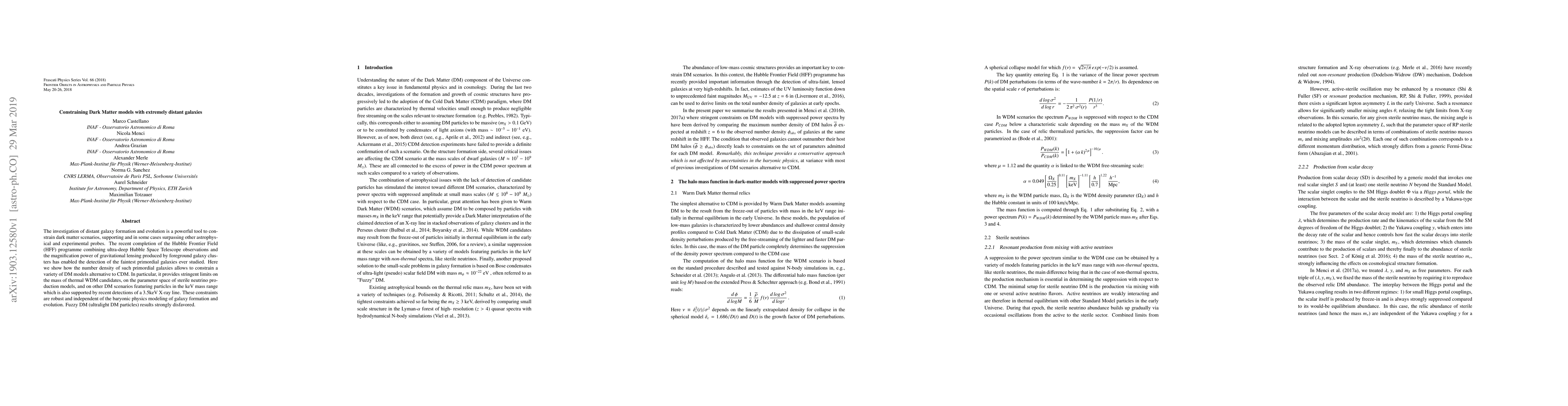 Research constrains dark matter models using extremely distant galaxies, setting limits on thermal WDM candidates, sterile neutrino production models, and ultralight DM particles.