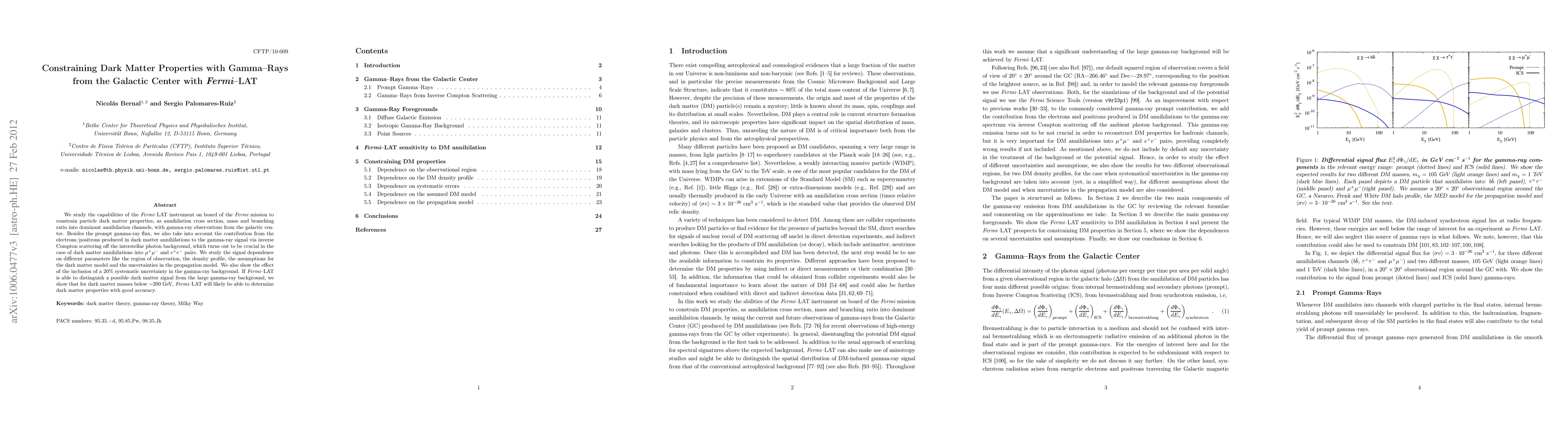 This paper investigates Fermi-LAT's ability to constrain dark matter properties using gamma-ray observations from the galactic center, considering both prompt gamma rays and secondary signals from inverse Compton scattering. It concludes that Fermi-LAT can accurately determine dark matter properties for masses below ~200 GeV if it can distinguish the dark matter signal from background noise.