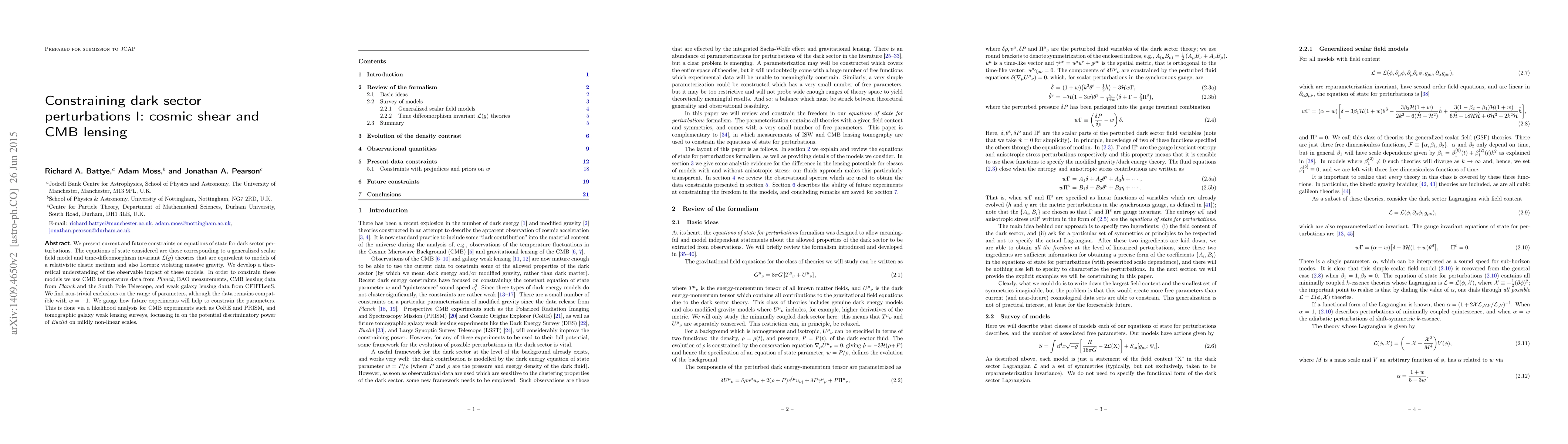 We present current and future constraints on equations of state for dark sector perturbations. The equations of state considered are those corresponding to a generalized scalar field model and time-diffeomorphism invariant $L(g)$ theories that are equivalent to models of a relativistic elastic medium and also Lorentz violating massive gravity. We develop a theoretical understanding of the observable impact of these models. In order to constrain these models we use CMB temperature data from Planck, BAO measurements, CMB lensing data from Planck and the South Pole Telescope, and weak galaxy lensing data from CFHTLenS. We find non-trivial exclusions on the range of parameters, although the data remains compatible with $w=-1$. We gauge how future experiments will help to constrain the parameters. This is done via a likelihood analysis for CMB experiments such as CoRE and PRISM, and tomographic galaxy weak lensing surveys, focussing in on the potential discriminatory power of Euclid on mildly non-linear scales.