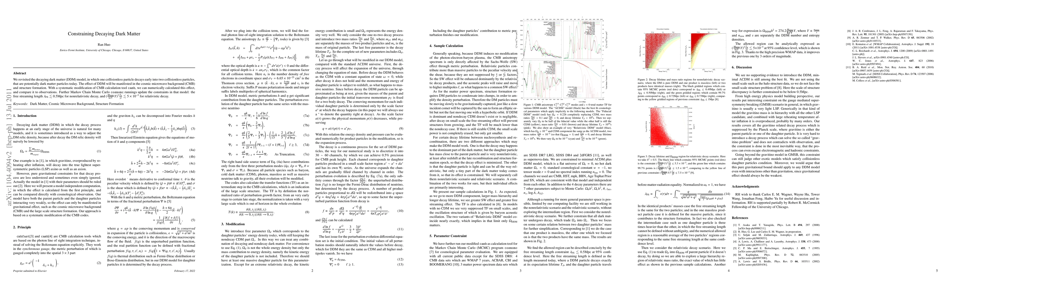 This paper revisits the decaying dark matter model, where early-universe decay of a collisionless particle influences the cosmic microwave background and structure formation. Using modified CMB calculations and MCMC analysis, it constrains the free streaming length and decay parameters, finding $\lambda_{FS}\lesssim0.5$ Mpc for nonrelativistic decay and $((M_{DDM}/keV) Y)^2 (T_d/yr)\lesssim5\times10^{-5}$ for relativistic decay.