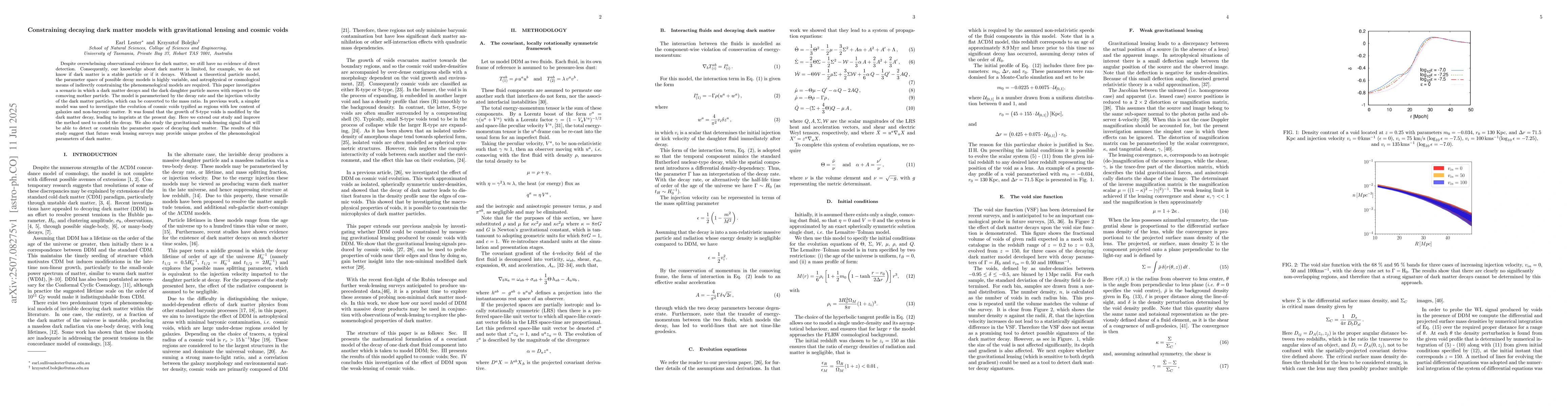 This research explores how decaying dark matter affects cosmic voids and gravitational lensing, proposing that future lensing surveys could constrain dark matter decay parameters.