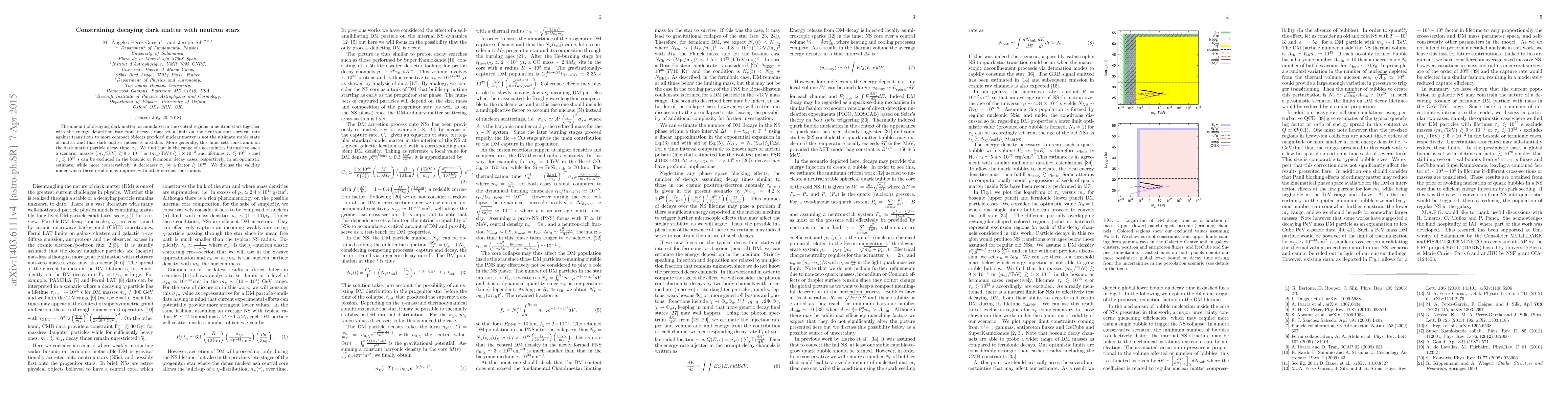 The amount of decaying dark matter, accumulated in the central regions in neutron stars together with the energy deposition rate from decays, may set a limit on the neutron star survival rate against transitions to more compact objects provided nuclear matter is not the ultimate stable state of matter and that dark matter indeed is unstable. More generally, this limit sets constraints on the dark matter particle decay time, $\tau_{\chi}$. We find that in the range of uncertainties intrinsic to such a scenario, masses $(m_{\chi}/ \rm TeV) \gtrsim 9 \times 10^{-4}$ or $(m_{\chi}/ \rm TeV) \gtrsim 5 \times 10^{-2}$ and lifetimes ${\tau_{\chi}}\lesssim 10^{55}$ s and ${\tau_{\chi}}\lesssim 10^{53}$ s can be excluded in the bosonic or fermionic decay cases, respectively, in an optimistic estimate, while more conservatively, it decreases $\tau_{\chi}$ by a factor $\gtrsim10^{20}$. We discuss the validity under which these results may improve with other current constraints.