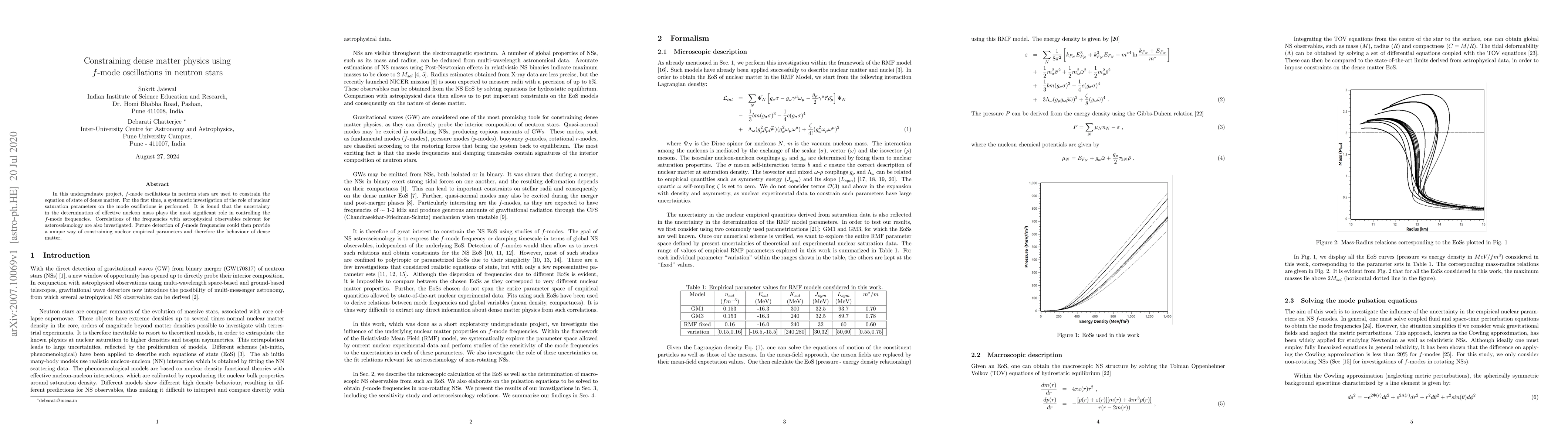 In this undergraduate project, f-mode oscillations in neutron stars are used to constrain the equation of state of dense matter. For the first time, a systematic investigation of the role of nuclear saturation parameters on the mode oscillations is performed. It is found that the uncertainty in the determination of effective nucleon mass plays the most significant role in controlling the f-mode frequencies. Correlations of the frequencies with astrophysical observables relevant for asteroseismology are also investigated. Future detection of f-mode frequencies could then provide a unique way of constraining nuclear empirical parameters and therefore the behaviour of dense matter.