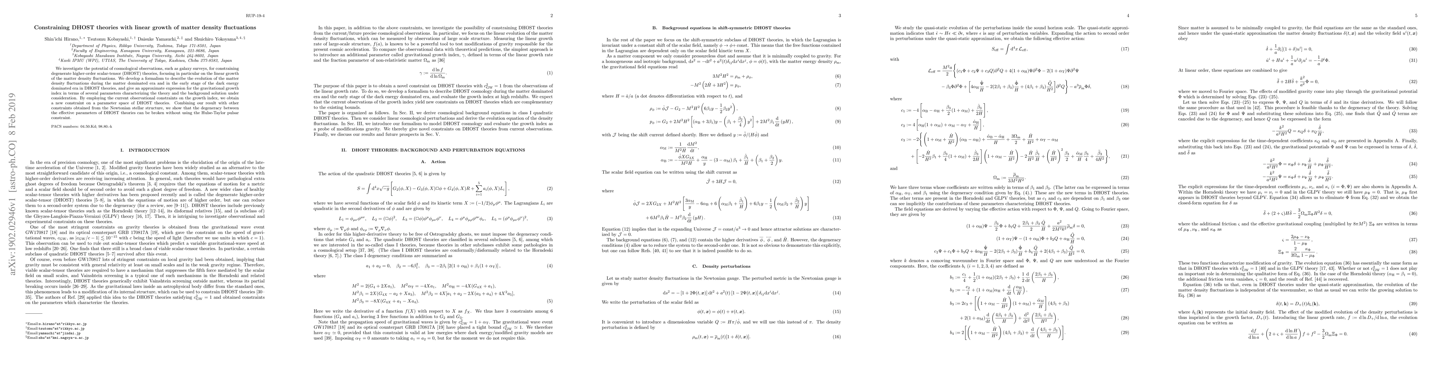 This paper develops a formalism to constrain degenerate higher-order scalar-tensor (DHOST) theories using the linear growth of matter density fluctuations from cosmological observations. The study provides a new constraint on DHOST parameter space, breaking the degeneracy between effective parameters without relying on the Hulse-Taylor pulsar constraint.