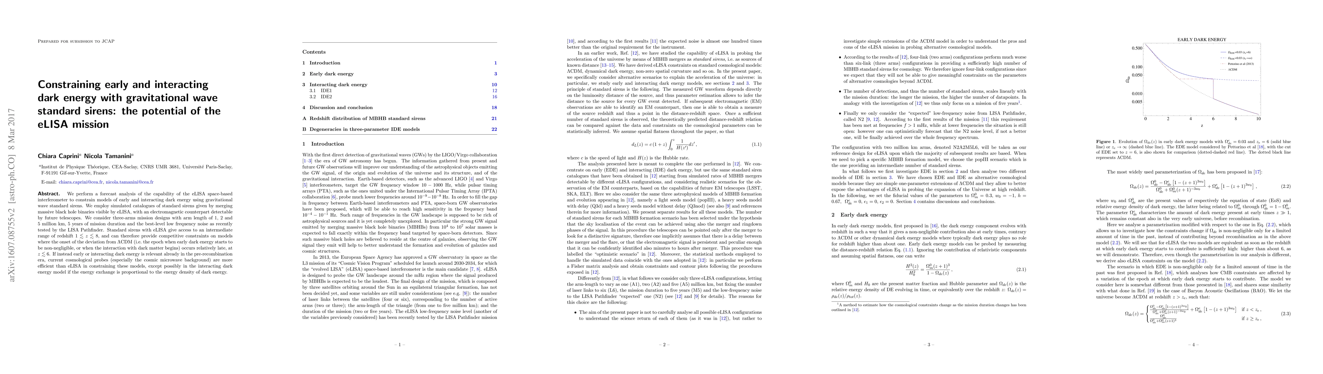 This paper forecasts eLISA's potential to constrain early and interacting dark energy models using gravitational wave standard sirens from merging massive black hole binaries. It finds that eLISA can provide competitive constraints for models where deviations from ΛCDM occur at redshifts $1\lesssim z \lesssim 8$.