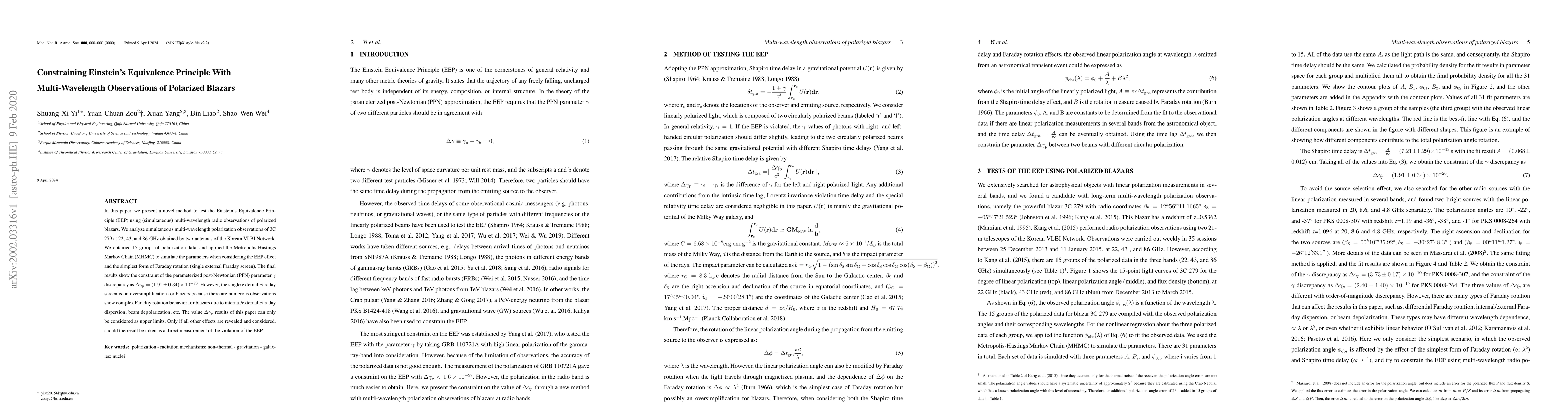 This paper introduces a new method to test Einstein's Equivalence Principle using multi-wavelength radio observations of polarized blazars. The study constrains the parameterized post-Newtonian parameter $\gamma$ with a discrepancy of $\Delta \gamma_{p} = (1.91\pm0.34)\times10^{-20}$, but acknowledges that this result is an upper limit due to oversimplifications in modeling Faraday rotation.