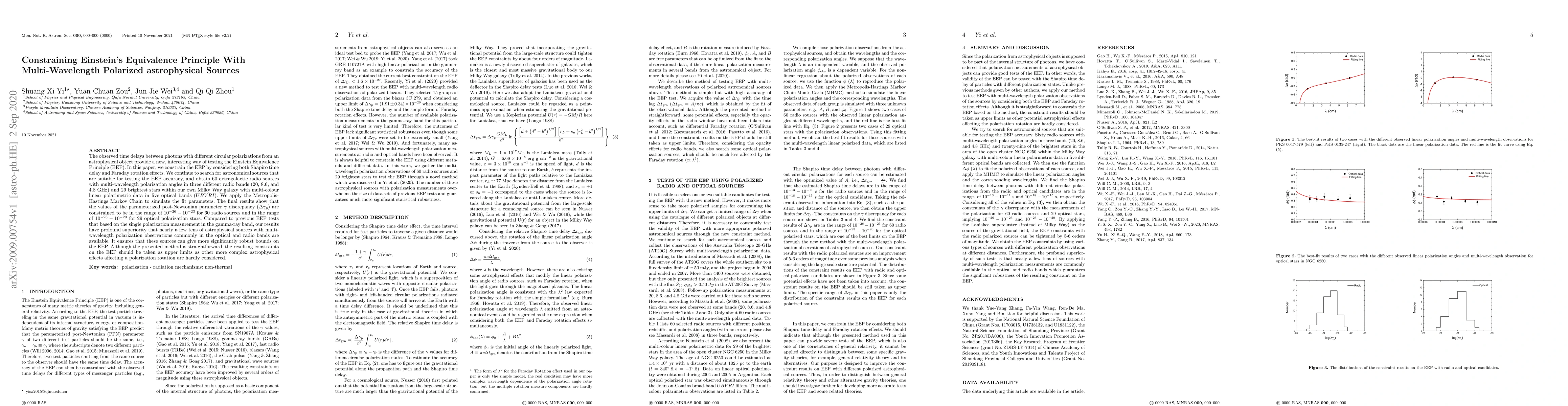 This paper tests Einstein's Equivalence Principle (EEP) using multi-wavelength polarized astrophysical sources, finding time delays between differently polarized photons. The study constrains EEP parameters to ranges of $10^{-26}-10^{-23}$ for 60 radio sources and $10^{-23}-10^{-20}$ for 29 optical stars, providing more robust bounds than previous gamma-ray tests.