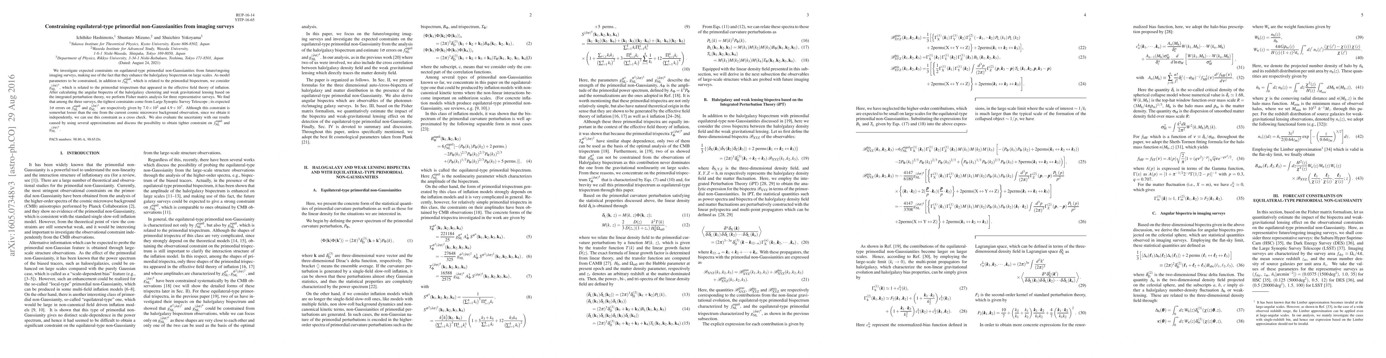 This paper investigates constraints on equilateral-type primordial non-Gaussianities from future/ongoing imaging surveys, finding that the Large Synoptic Survey Telescope will provide the tightest limits with $1\sigma$ errors of $7.0 \times 10^2$ on $f_{\rm NL}^{\rm equil}$ and $4.9 \times 10^7$ on $g_{\rm NL}^{(\partial \sigma)^4}$. These results serve as an independent cross-check to current cosmic microwave background observations.