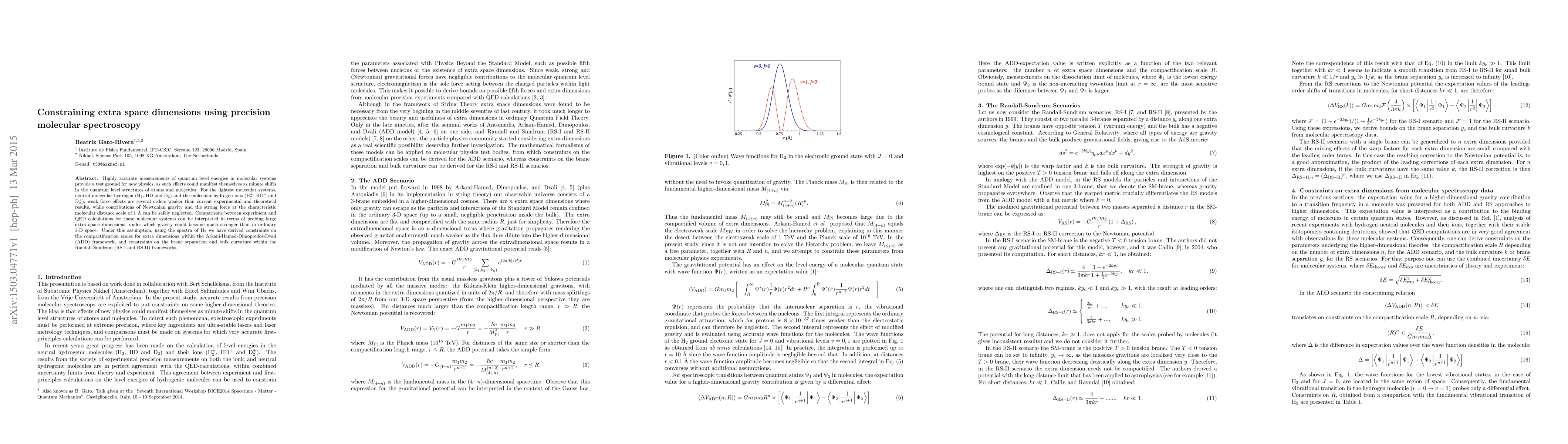 This paper uses highly precise molecular spectroscopy to test for the presence of extra space dimensions, finding minute shifts in quantum energy levels that could indicate large extra dimensions. It derives constraints on compactification scales within the ADD framework and on brane separation and bulk curvature in the Randall-Sundrum models.
