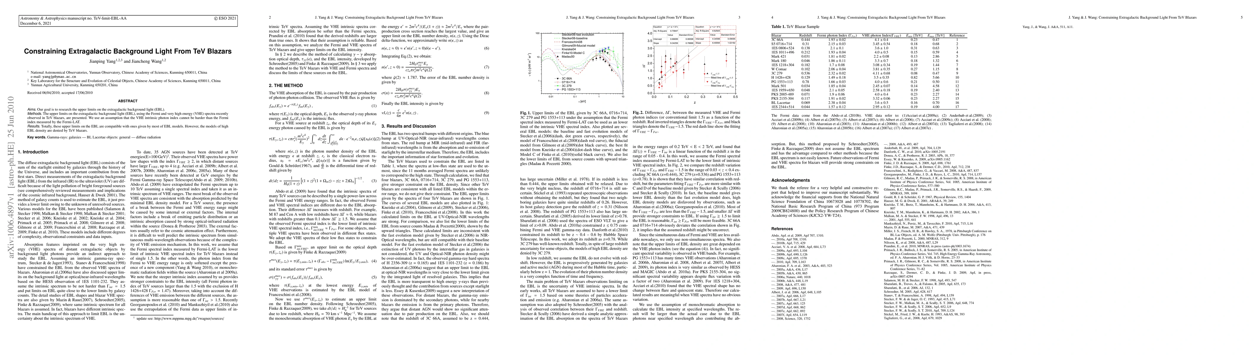 This study sets upper limits on the extragalactic background light (EBL) using TeV blazar observations from Fermi and VHE spectra, finding compatibility with most EBL models but refuting those with high EBL densities.