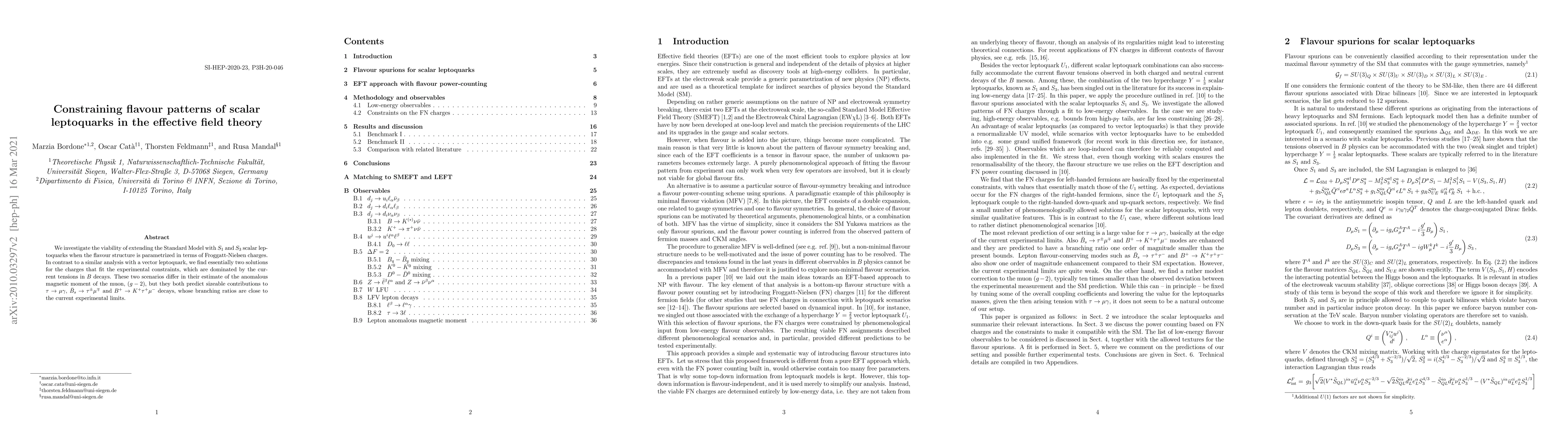 We investigate the viability of extending the Standard Model with $S_1$ and $S_3$ scalar leptoquarks when the flavour structure is parametrized in terms of Froggatt-Nielsen charges. In contrast to a similar analysis with a vector leptoquark, we find essentially two solutions for the charges that fit the experimental constraints, which are dominated by the current tensions in $B$ decays. These two scenarios differ in their estimate of the anomalous magnetic moment of the muon, $(g-2)$, but they both predict sizeable contributions to $\tau\to\mu\gamma$, $\bar B_s\to\tau^\pm\mu^\mp$ and $B^+\to K^+\tau^+\mu^-$ decays, whose branching ratios are close to the current experimental limits.