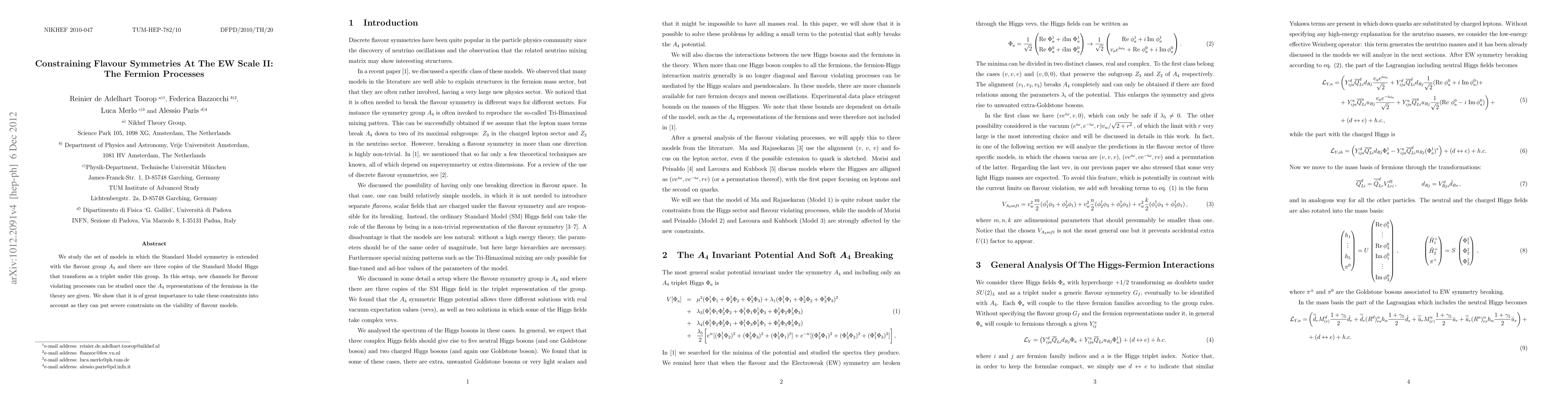 We study the set of models in which the Standard Model symmetry is extended with the flavour group A4 and there are three copies of the Standard Model Higgs that transform as a triplet under this group. In this setup, new channels for flavour violating processes can be studied once the A4 representations of the fermions in the theory are given. We show that it is of great importance to take these constraints into account as they can put severe constraints on the viability of flavour models.