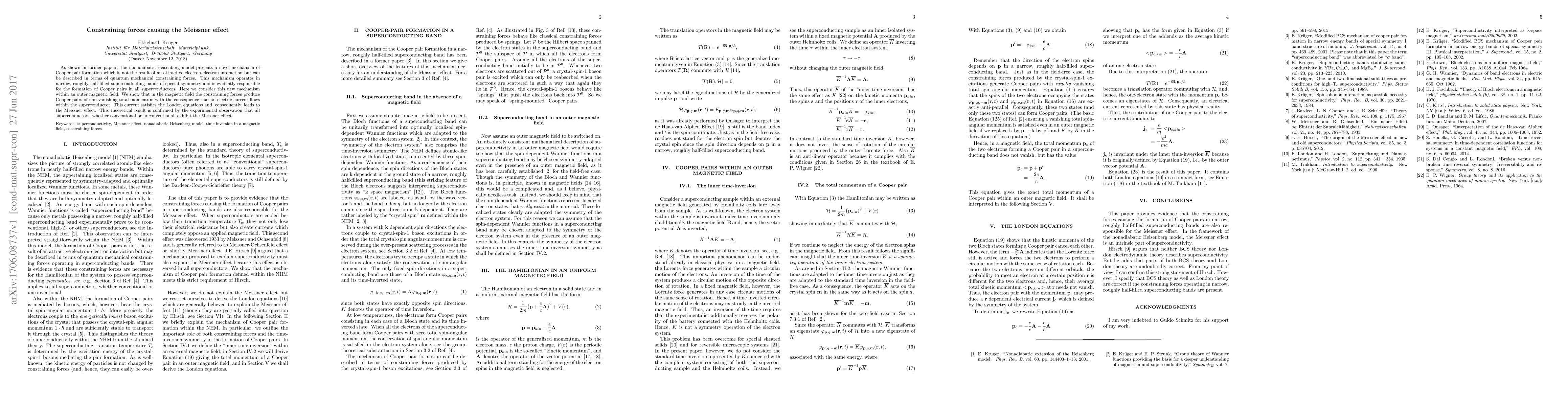 As shown in former papers, the nonadiabatic Heisenberg model presents a novel mechanism of Cooper pair formation which is not the result of an attractive electron-electron interaction but can be described in terms of quantum mechanical constraining forces. This mechanism operates in narrow, roughly half-filled superconducting bands of special symmetry and is evidently responsible for the formation of Cooper pairs in all superconductors. Here we consider this new mechanism within an outer magnetic field. We show that in the magnetic field the constraining forces produce Cooper pairs of non-vanishing total momentum with the consequence that an electric current flows within the superconductor. This current satisfies the London equations and, consequently, leads to the Meissner effect. This theoretical result is confirmed by the experimental observation that all superconductors, whether conventional or unconventional, exhibit the Meissner effect.