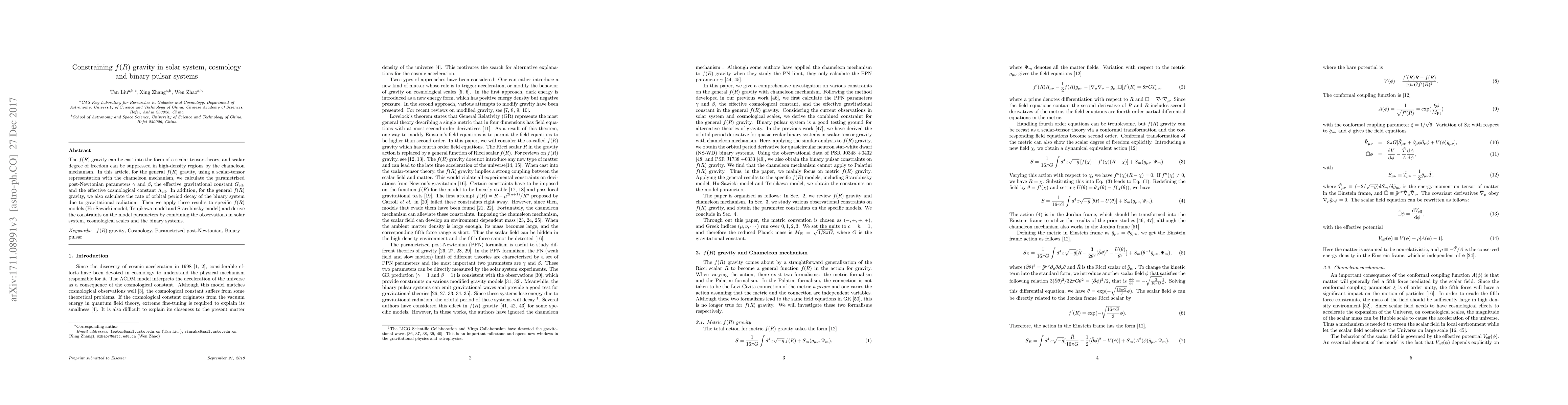 This paper investigates $f(R)$ gravity using a scalar-tensor representation with the chameleon mechanism, calculating key parameters like $\gamma$, $\beta$, $G_{\rm eff}$, and $\Lambda_{\rm eff}$. It also determines the orbital decay rate for binary systems, then applies these calculations to specific $f(R)$ models to derive constraints on their parameters from solar system, cosmological, and binary pulsar observations.