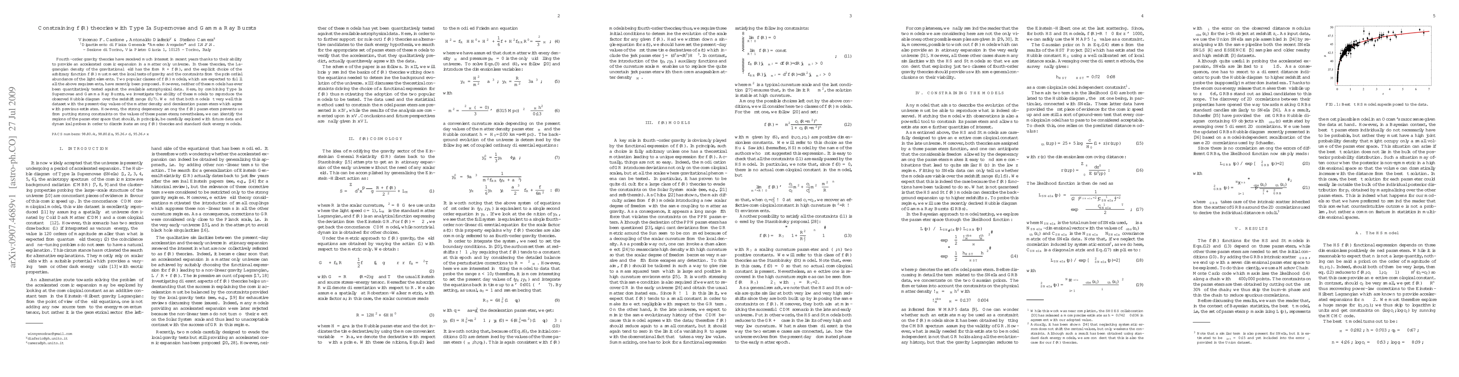 This paper investigates the compatibility of f(R) gravity theories with observational data from Type Ia Supernovae and Gamma Ray Bursts, finding that two popular f(R) models fit the observed Hubble diagram well but suffer from strong parameter degeneracies, thus limiting the ability to constrain the models. Future data and dynamical probes are suggested to better discriminate between f(R) theories and standard dark energy models.