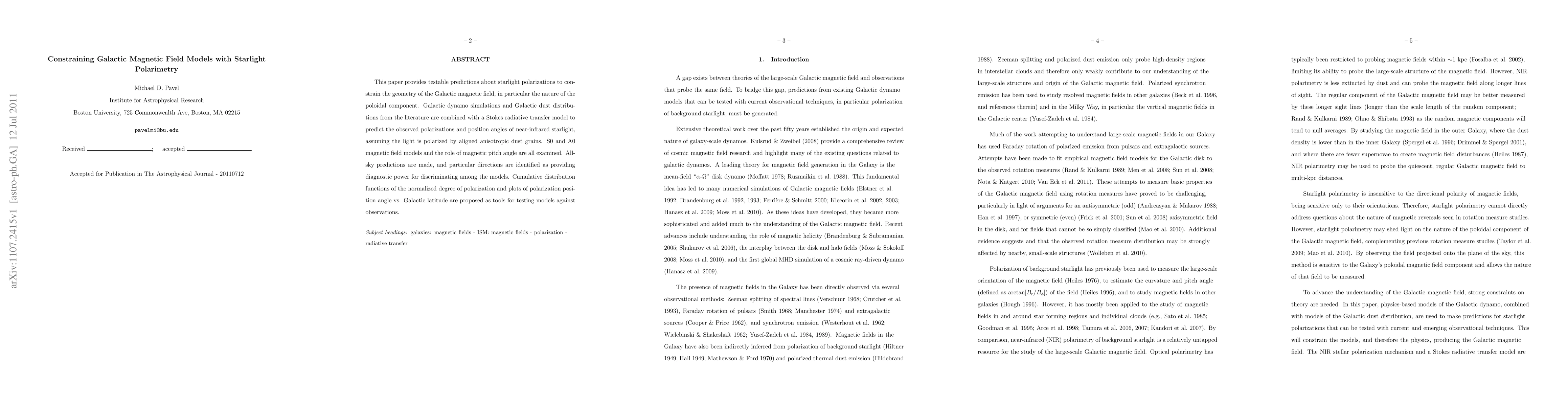 This paper provides testable predictions about starlight polarizations to constrain the geometry of the Galactic magnetic field, in particular the nature of the poloidal component. Galactic dynamo simulations and Galactic dust distributions from the literature are combined with a Stokes radiative transfer model to predict the observed polarizations and position angles of near-infrared starlight, assuming the light is polarized by aligned anisotropic dust grains. S0 and A0 magnetic field models and the role of magnetic pitch angle are all examined. All-sky predictions are made, and particular directions are identified as providing diagnostic power for discriminating among the models. Cumulative distribution functions of the normalized degree of polarization and plots of polarization position angle vs. Galactic latitude are proposed as tools for testing models against observations.