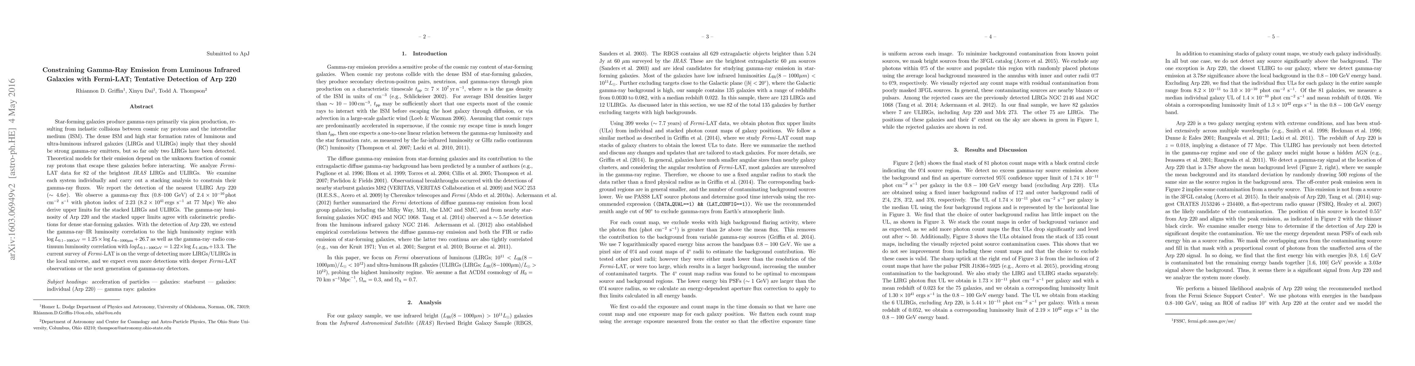This paper analyzes Fermi-LAT data to detect gamma-ray emissions from luminous infrared galaxies, finding a tentative detection of Arp 220. The study extends gamma-ray-IR luminosity and gamma-ray-radio luminosity correlations to high luminosity regimes, suggesting that deeper Fermi-LAT observations or next-generation gamma-ray detectors could detect more such galaxies.