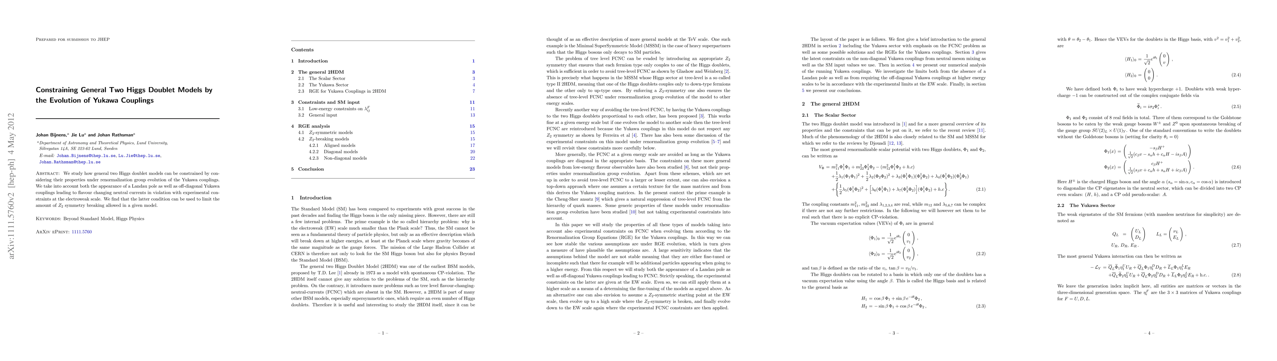 This paper investigates how the renormalization group evolution of Yukawa couplings constrains general two Higgs doublet models, focusing on the emergence of Landau poles and off-diagonal Yukawa couplings that violate experimental constraints, thereby limiting Z2 symmetry breaking.