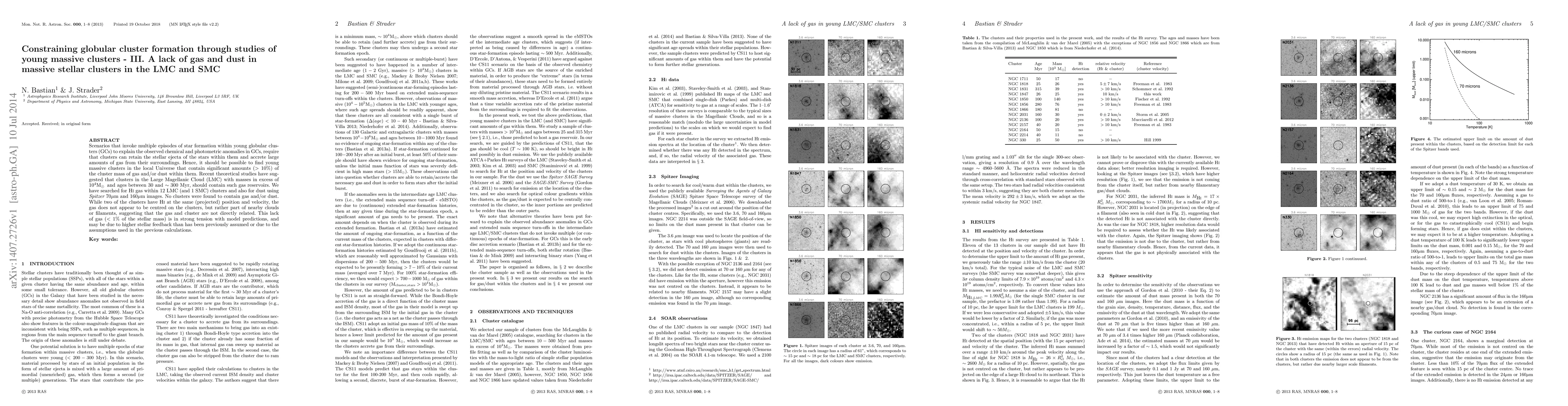 This study finds no significant gas or dust in young massive clusters in the LMC and SMC, contradicting models predicting substantial gas retention in such clusters. The observed gas is not centered on the clusters, suggesting it may not be directly related to them, which challenges current theories of globular cluster formation.