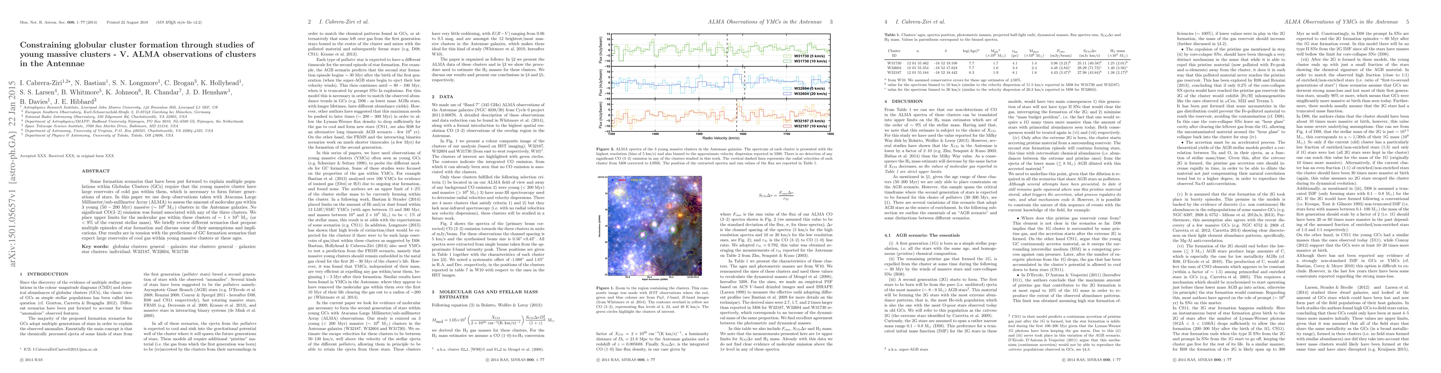Some formation scenarios that have been put forward to explain multiple populations within Globular Clusters (GCs) require that the young massive cluster have large reservoirs of cold gas within them, which is necessary to form future generations of stars. In this paper we use deep observations taken with Atacama Large Millimeter/sub-millimeter Array (ALMA) to assess the amount of molecular gas within 3 young (50-200 Myr) massive (~10^6 Msun) clusters in the Antennae galaxies. No significant CO(3--2) emission was found associated with any of the three clusters. We place upper limits for the molecular gas within these clusters of ~1x10^5 Msun (or <9 % of the current stellar mass). We briefly review different scenarios that propose multiple episodes of star formation and discuss some of their assumptions and implications. Our results are in tension with the predictions of GC formation scenarios that expect large reservoirs of cool gas within young massive clusters at these ages.