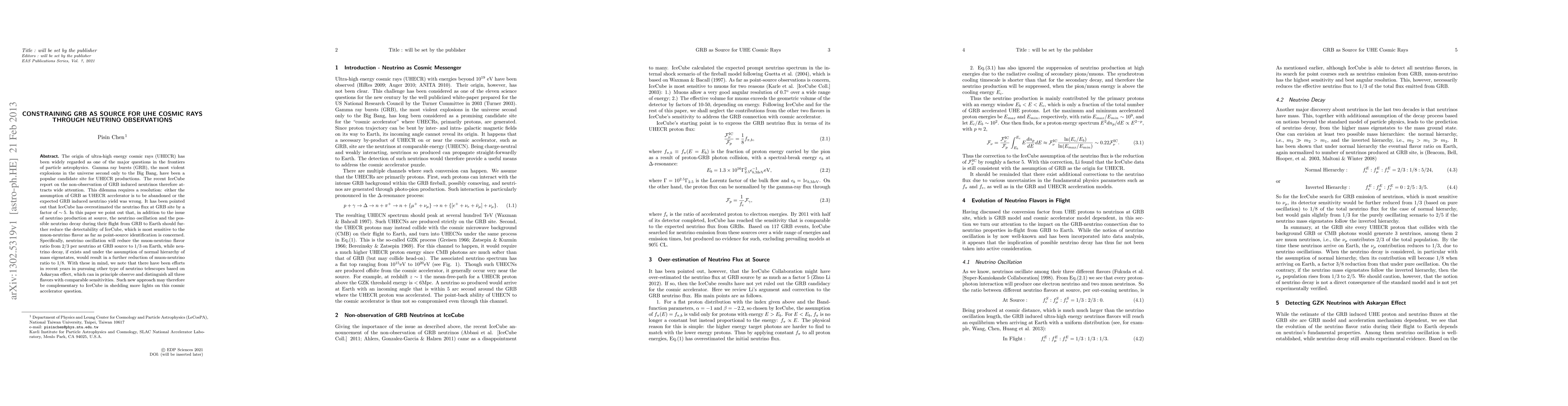 The research analyzes the possibility of Gamma Ray Bursts (GRBs) as sources of Ultra-High Energy Cosmic Rays (UHECRs) through neutrino observations, correcting for overestimation of neutrino flux by IceCube and considering neutrino oscillation and decay during their flight to Earth.