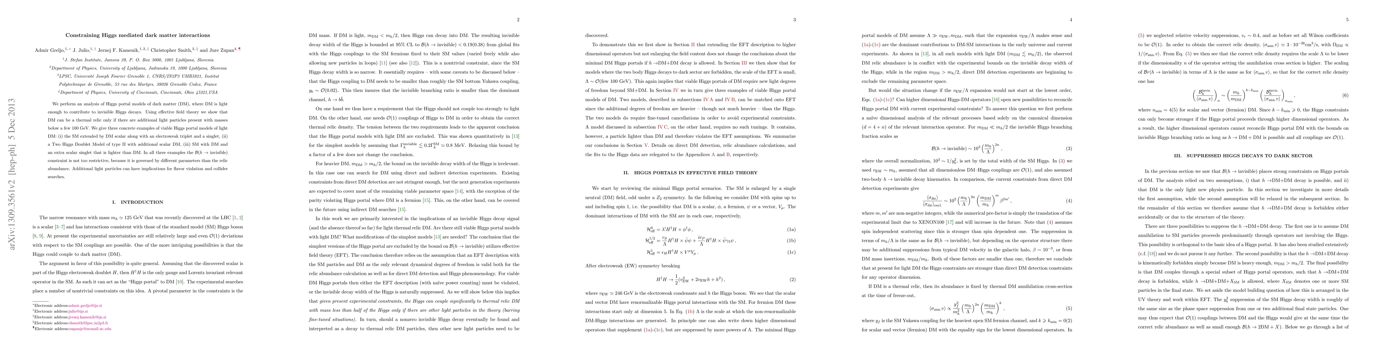 We perform an analysis of Higgs portal models of dark matter (DM), where DM is light enough to contribute to invisible Higgs decays. Using effective field theory we show that DM can be a thermal relic only if there are additional light particles present with masses below a few 100 GeV. We give three concrete examples of viable Higgs portal models of light DM: (i) the SM extended by DM scalar along with an electroweak triplet and a singlet, (ii) a Two Higgs Doublet Model of type II with additional scalar DM, (iii) SM with DM and an extra scalar singlet that is lighter than DM. In all three examples the Br(h to invisible) constraint is not too restrictive, because it is governed by different parameters than the relic abundance. Additional light particles can have implications for flavor violation and collider searches.