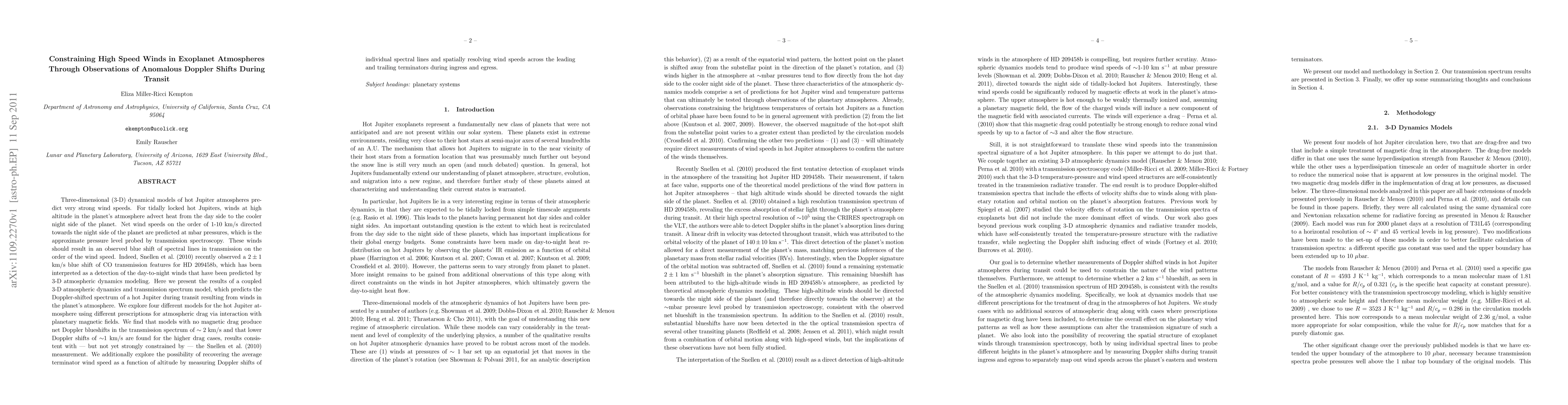 This paper investigates the high-speed winds in hot Jupiter atmospheres using 3-D dynamical models and transmission spectroscopy, finding predicted Doppler shifts consistent with recent observations. The study explores different atmospheric drag models and suggests that spatially resolving Doppler shifts could reveal average wind speeds across the planet's terminator.