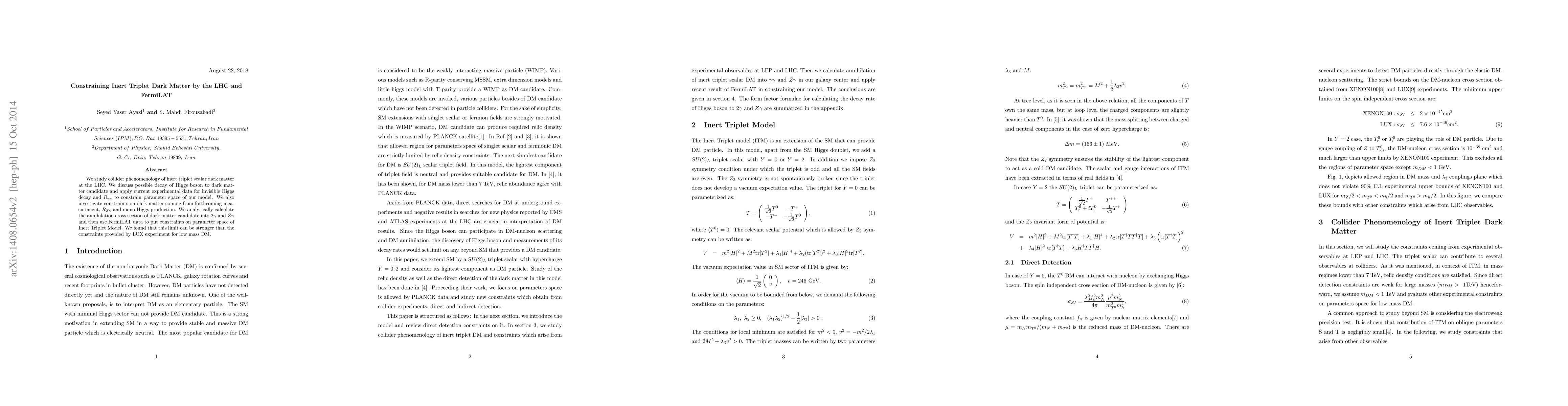 This paper investigates the inert triplet scalar dark matter model through LHC and FermiLAT data, constraining its parameter space by analyzing Higgs decay, $R_{\gamma\gamma}$, and $R_{Z\gamma}$ measurements. It finds that FermiLAT data can impose stronger constraints than the LUX experiment for low-mass dark matter.