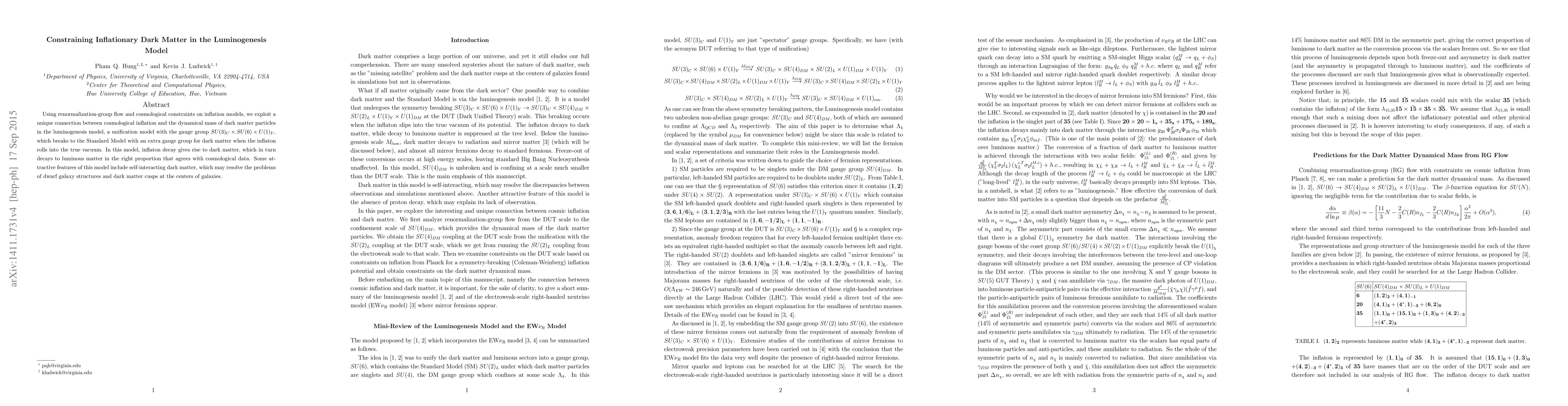 Using renormalization-group flow and cosmological constraints on inflation models, we exploit a unique connection between cosmological inflation and the dynamical mass of dark-matter particles in the luminogenesis model, a unification model with the gauge group $SU(3)_C \times SU(6) \times U(1)_Y$, which breaks to the Standard Model with an extra gauge group for dark matter when the inflaton rolls into the true vacuum. In this model, inflaton decay gives rise to dark matter, which in turn decays to luminous matter in the right proportion that agrees with cosmological data. Some attractive features of this model include self-interacting dark matter, which may resolve the problems of dwarf-galaxy structures and dark-matter cusps at the centers of galaxies.
