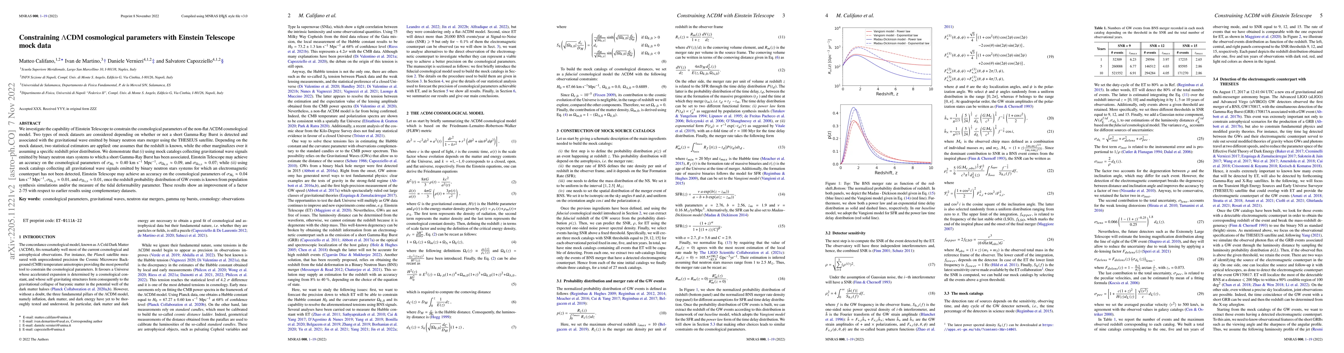 We investigate the capability of Einstein Telescope to constrain the cosmological parameters of the non-flat $\Lambda$CDM cosmological model. Two types of mock datasets are considered depending on whether or not a short Gamma-Ray Burst is detected and associated with the gravitational wave emitted by binary neutron stars merger using the THESEUS satellite. Depending on the mock dataset, two statistical estimators are applied: one assumes that the redshift is known, while the other marginalizes over it assuming a specific redshift prior distribution. We demonstrate that {\em (i)} using mock catalogs collecting gravitational wave signals emitted by binary neutron stars systems to which a short Gamma-Ray Burst has been associated, Einstein Telescope may achieve an accuracy on the cosmological parameters of $\sigma_{H_0}\approx 0.40$ km s$^{-1}$ Mpc$^{-1}$, $\sigma_{\Omega_{k,0}}\approx 0.09$, and $\sigma_{\Omega_{\Lambda,0}}\approx 0.07$; while {\em (ii)} using mock catalogs collecting all gravitational wave signals emitted by binary neutron stars systems for which an electromagnetic counterpart has not been detected, Einstein Telescope may achieve an accuracy on the cosmological parameters of $\sigma_{H_0}\approx 0.04$ km s$^{-1}$ Mpc$^{-1}$, $\sigma_{\Omega_{k,0}}\approx 0.01$, and $\sigma_{\Omega_{\Lambda,0}}\approx 0.01$, once the redshift probability distribution of GW events is known from population synthesis simulations and/or the measure of the tidal deformability parameter. These results show an improvement of a factor 2-75 with respect to earlier results using complementary datasets.
